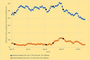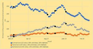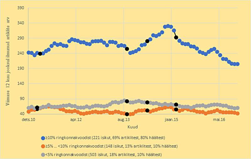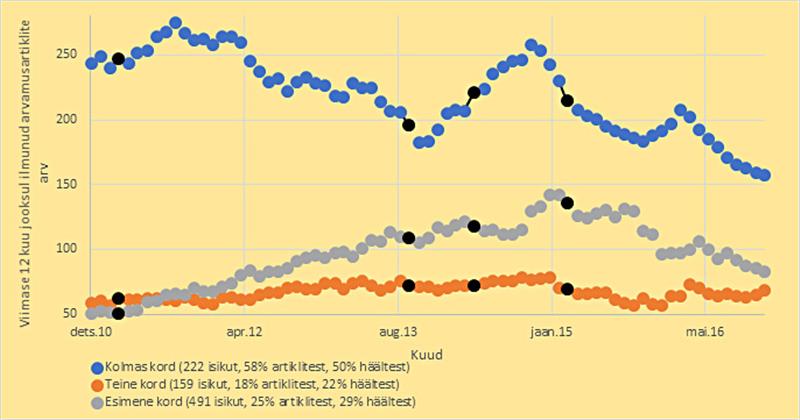 Kuna kuude lõikes on kõikumised suured, siis kõigil diagrammidel olen väiksema volatiilsuse huvides kasutanud 12 kuu libisevat keskmist, näiteks 2010. aasta detsembri all kajastuvad kõik artiklid, mis on ilmunud perioodil jaanuar 2010 – detsember 2010 ja 2011. aasta jaanuari all kajastuvad kõik artiklid, mis on ilmunud perioodil veebruar 2010 – jaanuar 2011 jne. Diagrammidel on mustade punktidega tähistatud toimunud valimised: märts 2011 – riigikogu valimised, oktoober 2013 – kohalikud valimised, mai 2014 – Euroopa Parlamendi valimised ja märts 2015 – riigikogu valimised.
