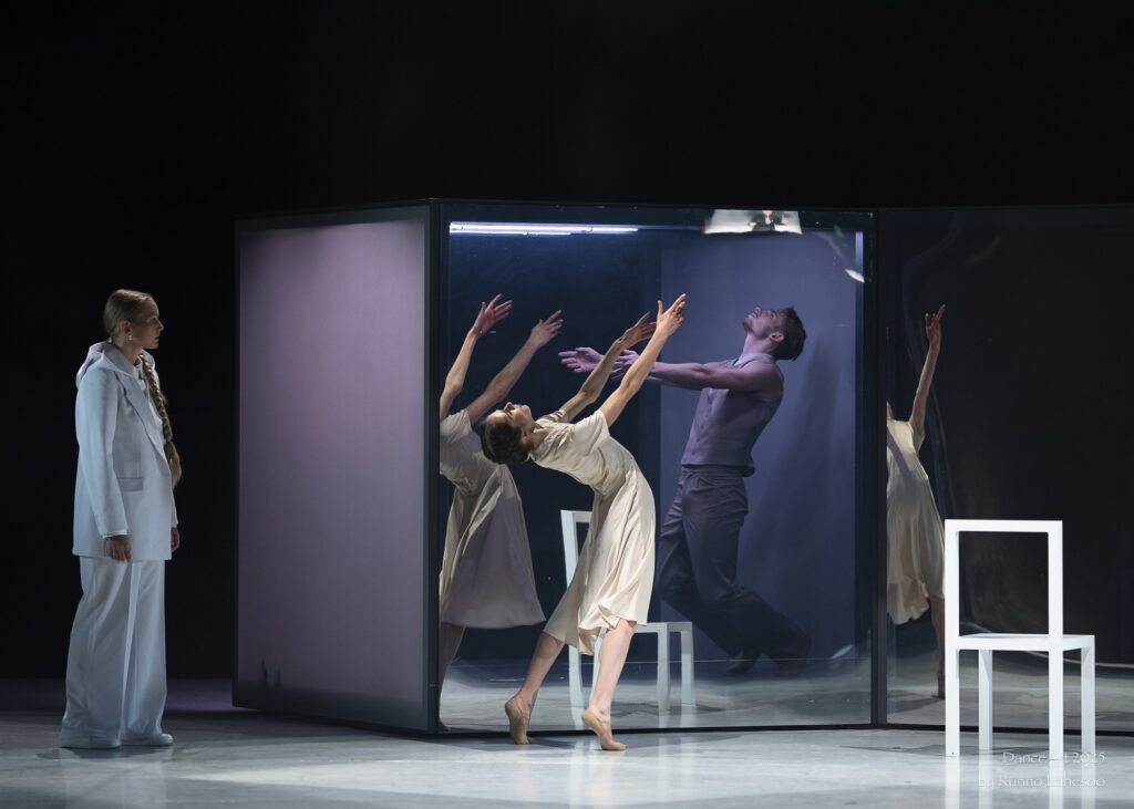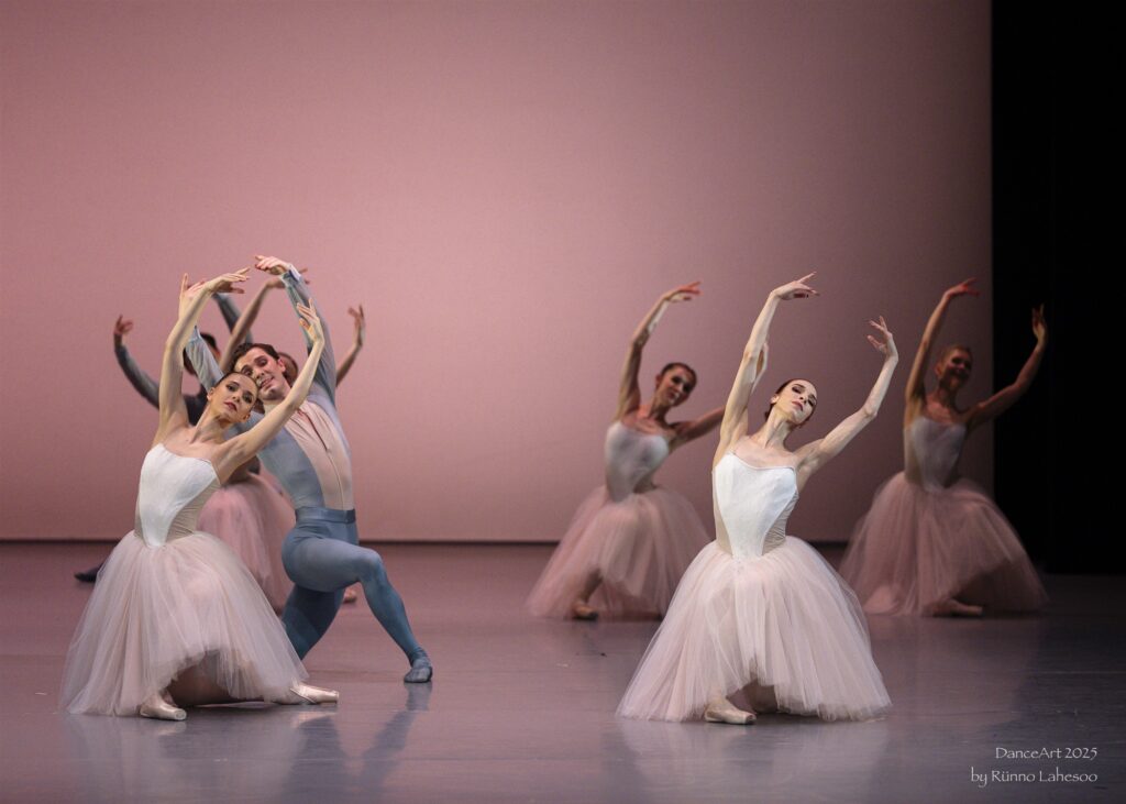 Trupp liigub geomeetrilise täpsusega, moodustades kauneid sümmeetrilisi jooniseid, mille keskel tõusevad väiksemad rühmad esile justkui muusikalised aktsendid. Meeste etteasted on jõulised, täis hüppeid ja pöördeid, tuues lavale füüsilise intensiivsuse, naised kehastavad liikumise voolavat joont, graatsiat ja harmooniat. Eriti kaunid on hetked, mil väiksem rühm – duett või trio – tantsib väljavalgustatult, samal ajal kui ülejäänud trupp jääb tagaplaanile tumeda siluetina helendaval taustal, justkui esiplaanil toimuvat kommenteeriv poeetiline koor.