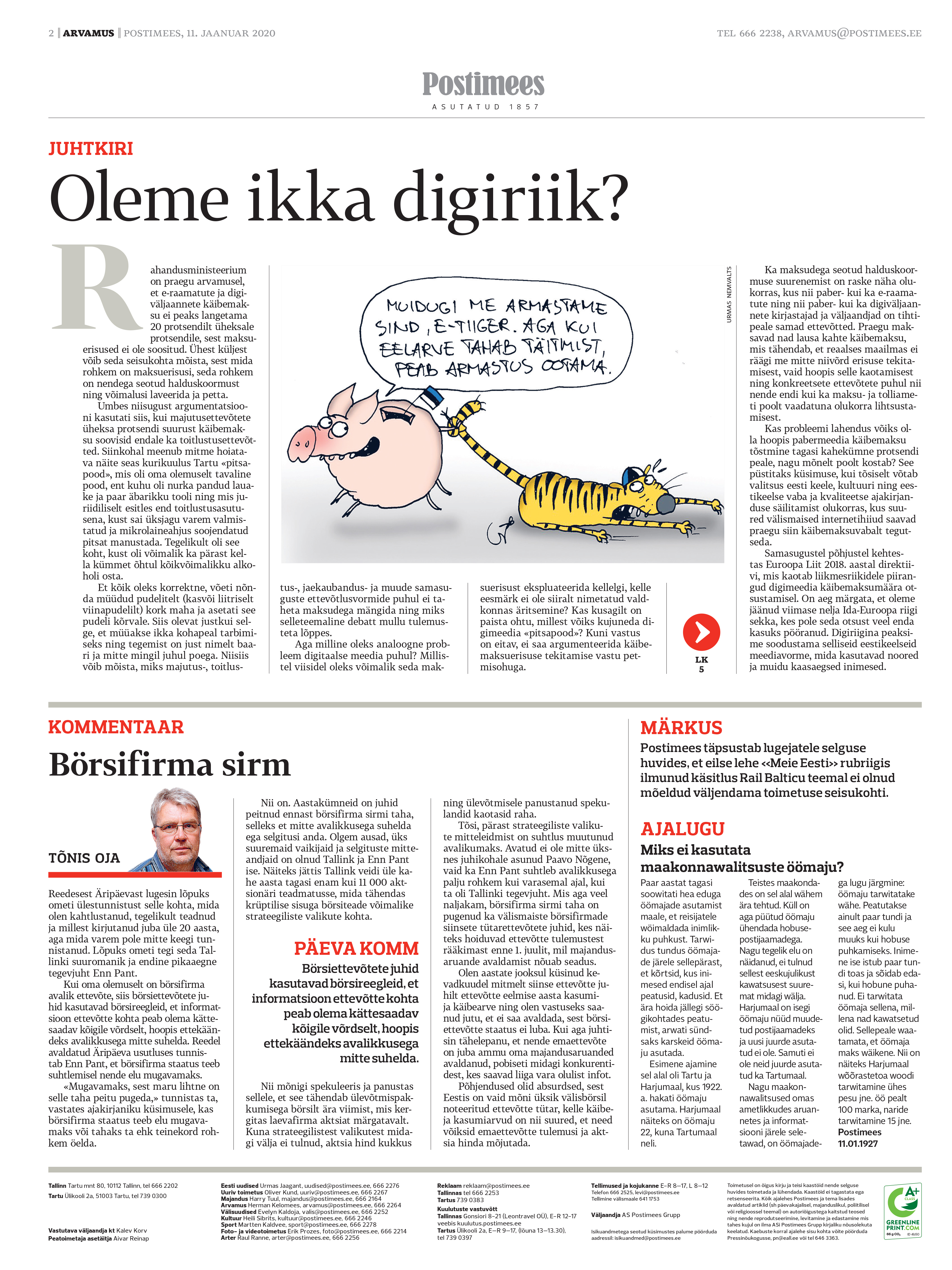 32 „Postimees täpsustab lugejatele selguse huvides, et eile lehe „Meie Eesti“ rubriigis ilmunud käsitlus Rail Balticu teemadel ei olnud mõeldud väljendama toimetuse seisukohti.“ – Postimees 11. I 2020.
