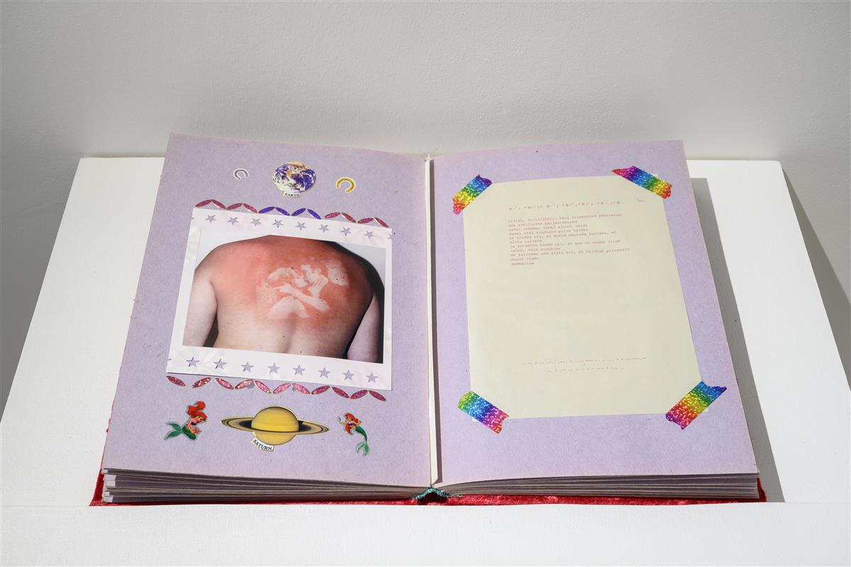 Kõige südamlikum teos on valminud neliku – kunstnike ja kuraatorite – ühistööna. Draakonis on külalistele lehitsemiseks pandud välja päevik, kus on kuupäevadega sissekandeid, pilte, kleepse jm. Miks see mulle eriliselt meeldis? Sest see meenutas oma vormilt ja esteetikalt teismelise päevikut, kuhu kirjutatakse oma päevast ja muust. Juurde sädelevad kleepsud ja nipet-näpet, mida puberteedieas tüdrukuga seostatakse. Ehk siis näitusetegijad võtsid stereotüübi ja tegid selle enda omaks. Teismelised tüdrukud langevad sageli pilkealuseks: roosamanna ja kleepsudega päevikupidamine on imal tegevus. Ometi ei pea seda sugugi nõnda vaatama.