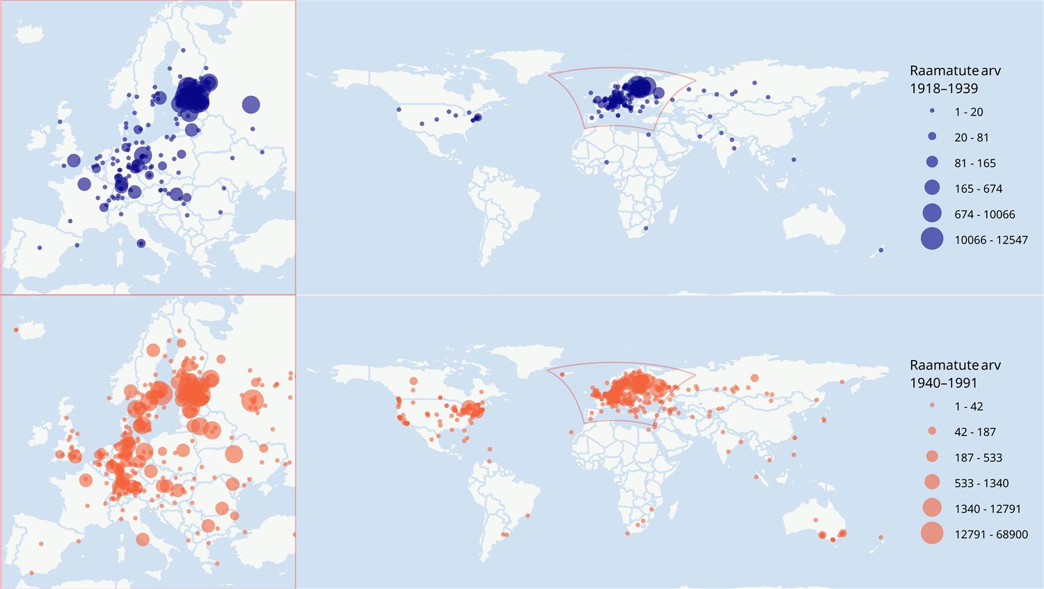Ilmumiskohad ja neile kureerimise käigus lisatud koordinaadid võimaldavad hõlpsasti saada ülevaate eesti raamatute geograafilisest levikust. See suurenes järsult XX sajandi II poolel peamiselt tänu eesti diasporaale. Näiteks anti vahemikus 1940–1991 Stockholmis teadaolevalt välja 1340 raamatut, millest üle poole on eestikeelsed ja suur osa käsitleb Eestit või eestlasi; Stockholmile järgnesid Toronto ja Lund. Kuigi suurem osa kirjastustegevusest toimus Lääne-Euroopas ja Põhja-Ameerikas, ilmus eestikeelseid ja Eesti-ainelisi raamatuid ka näiteks Venezuelas, Brasiilias, Argentinas, Lõuna-Aafrika vabariigis, Jaapanis ja mujal.