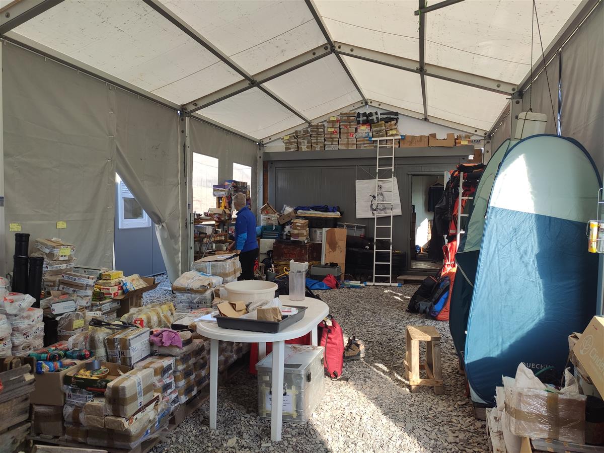 Poola jaama sisevaade. Kolme soojaku vahele on tõmmatud telk, kus ladustatakse toitu ja kus on töökojanurk ja dušinurk.