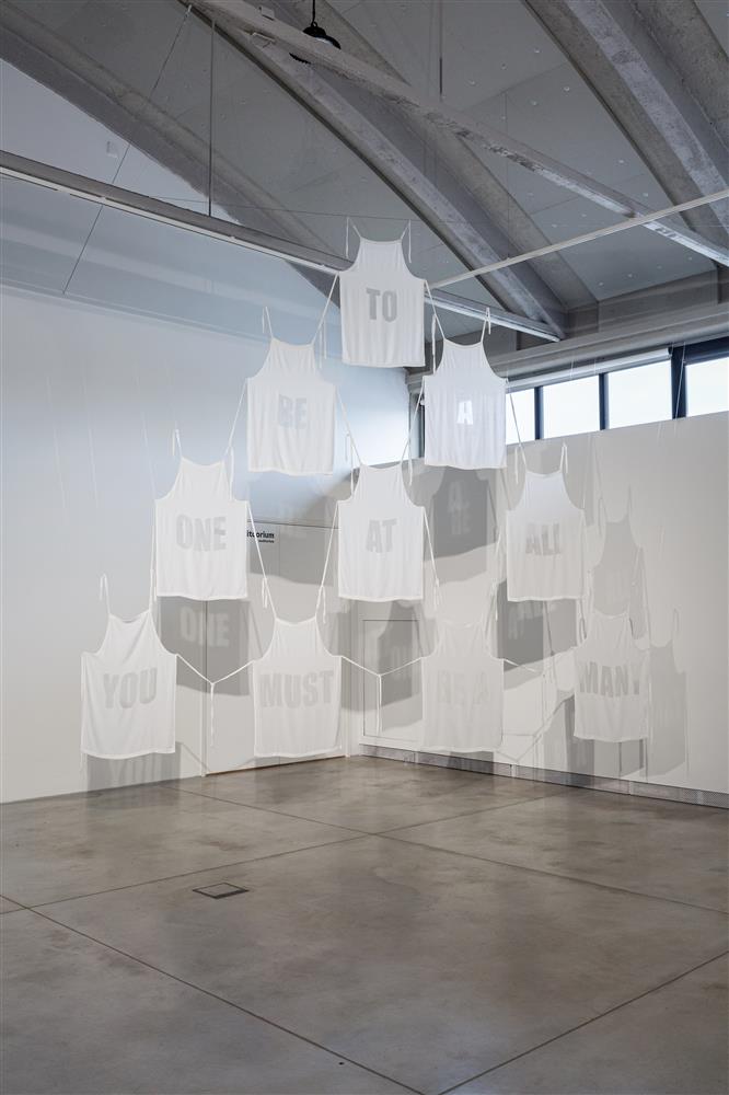 Kõige selgemat sotsiaalset sõnumit kannab tekstiilikunstnik Sandra Kosorotova installatsioon. Püramiidina rippuvate särkide rinnapealsetest on loosunglikult lõigatud välja sõnad. Neid kokku veerides saab lause „Et üldse olla, on vaja paljusid“.