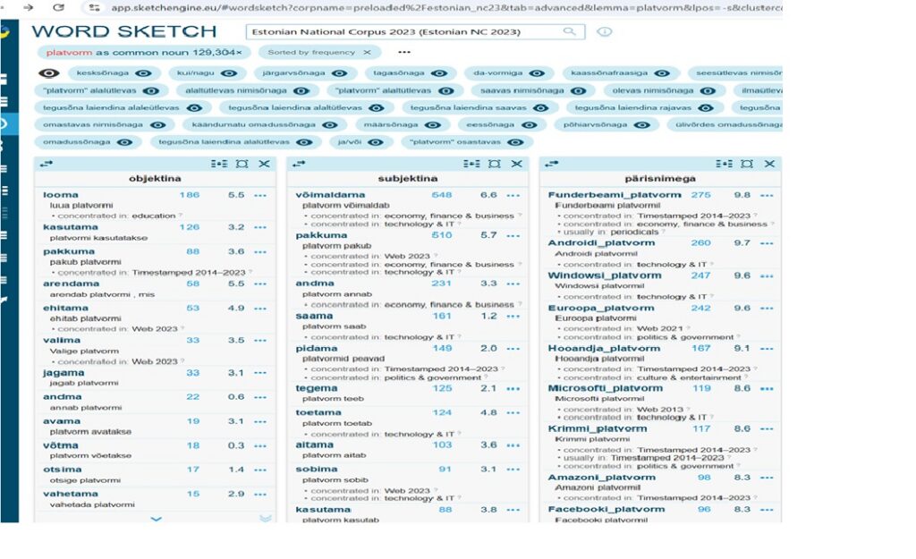 Selle sõna kasutamine näitab ilmekalt, kuidas aeg annab sõnadele uusi tähendusi. Kui 30 aastat tagasi seostati platvormi peamiselt ümbrusest kõrgemal asuva lava või mandrikoore alaga (vt Eesti Entsüklopeedia, 1994),1 siis praeguseks on sellele lisandunud infotehnoloogia ja selle rakendamise mõõde ning tähendus. Eesti keelekorpuses esineb sõna „platvorm“ kokku 129 304 korda.2 Siiski moodustub selle seostest teiste sõnadega pigem killustunud pilt: isegi kõige sagedasem tähenduslik seos – platvorm subjektina koos verbiga „võimaldama“ – esineb vähem kui 0,5% kõigist juhtudest.