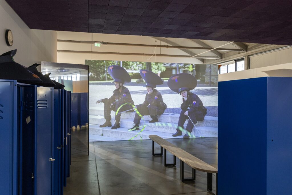 Seega on tegu nõiaringiga. Hädad algavad hoopis kuskilt mujalt. Sellele osutabki dissonants, mis Flo Kasearu näitusel pidevalt kaasa kõlab. Dissonantsi võti antakse õigupoolest kätte juba sissejuhatavas installatsioonis „Kaose patrull“, mille video seda väga järjekindlalt eksplitseerib. Seitse mundris tegelast, kes liiguvad tänavatel, peas ogaralt laiad vormimütsid, mängivad alatasa võimlemislintidega, mis õigupoolest on triibulised piirdelindid. See hälbiv toiming ei vii mingi lahenduseni ega osutagi millelegi: oluline on dissonants ise. Samasugused on valguskastid „Politsei palub abi“ ja „Meie maja põleb“. Viimase pealkiri on küll tsitaat Greta Thunbergi kuulsast Davosi kõnest, ja seega päris ühemõtteline, aga tuletõrjekiivrites lapsed, kes kuidagi abitult metsa­serval seisavad, loovad ikkagi dissonantsi. Midagi on veel ütlemata; midagi jääb läve taha, kuhu meie pilk ei ulatu, või ei oska me õieti eristada, mida me seal näeme.