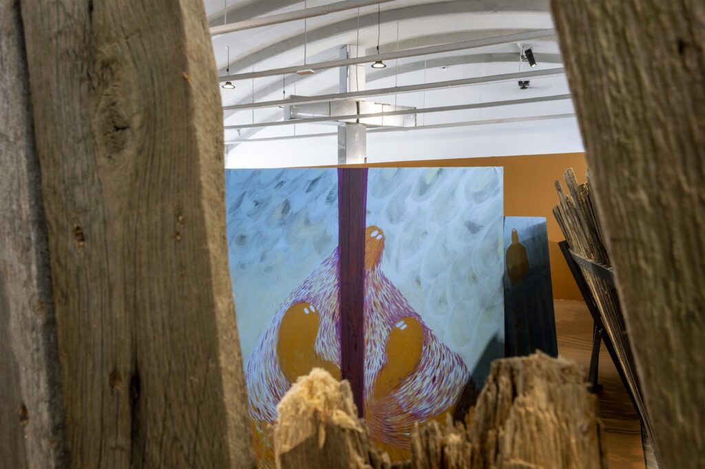 Nüüd tahaks astuda ruuge vaibaga kaetud saali, suurte maalide keskele. Aga ei saa! Lava, millel seisame, on liiga kõrge, ja sedagi ümbritseb piirav rant. Maalideni jõudmiseks peab julgema hüpata. See on veidi ohtlik, aga seda tasub siiski teha, sest nüüd hakkab avanema väljapaneku emotsionaalne taust. Näeme arvukalt piklike silmaavadega tegelasi, kes enam ei meenuta sokke, vaid on omajagu inimesekujulised. Nad kogunevad tumeda objekti ümber, arutavad midagi, klammerduvad, tõukavad, varjuvad, embavad, pööravad pilgu kuhugi üles, justkui ootaksid midagi. Vahel on nad karvased, vahel siledad. Piltidelt õhkub nõutust, ärevust, lootust, kartust. Need olevused ongi tunnete kehastused, omamoodi tundeloomad. Piltidel on kõnekaid pealkirju: „Nad peavad kuhugi minema“, „Energiajulgeolek“, „See siin on kogu mu elu“, „Mida nad varjavad“, „Tööstustsivilisatsioon“ jne. Need väljendavad autori avalikke mõtteid. Pildid ise aga kujutavad salajasi mõtteid, mis on hajuvad, püüdmatud, vaevu aimatavad.