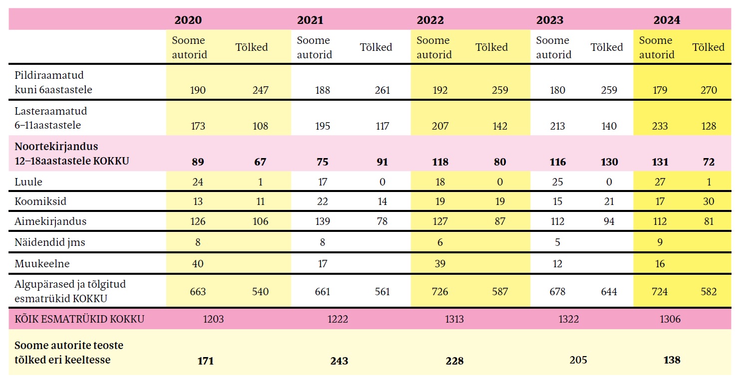 Selgituseks: Soomes peetakse aasta jooksul ilmunud lastele ja noortele suunatud esmatrükkide kohta arvestust kaheksas kategoorias1. Lisatud on rida, kus on aastate kaupa kirjas soome keelest teistesse keeltesse tõlgitud laste- ja noorteraamatute arv2.