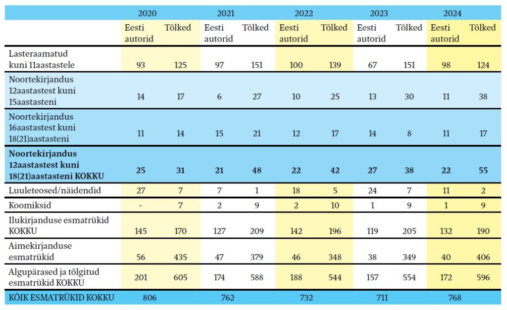 Missugune on samal ajavahemikul Eestis laste- ja noortekirjanduse esmatrükkide statistika? Ülevaate saamiseks koostasin soomlaste eeskujul tabeli (vt tabel 2). Aluseks on võetud lastekirjanduse keskuse koostatud mitteametlikud kirjandusnimestikud aastatest 2020–2024. (Võimalik, et eri spetsialistide arvamuse lisamisel arvud pisut erineksid.)