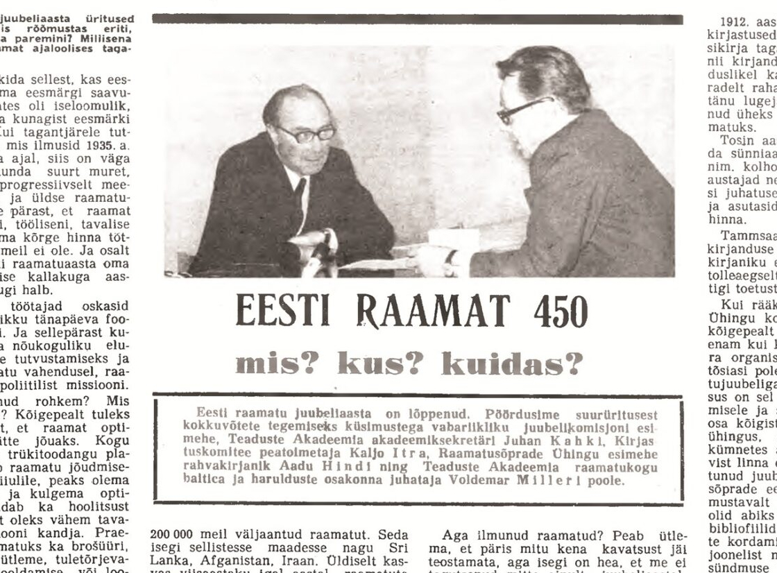 Eesti raamatu juubeliaasta on lõppenud. Pöördusime suurüritusest kokkuvõtete tegemiseks küsimustega vabariikliku juubelikomisjoni esimehe, Teaduste Akadeemia akadeemiksekretäri Juhan Kahki ja Kirjastuskomitee peatoimetaja Kaljo Itra poole.
