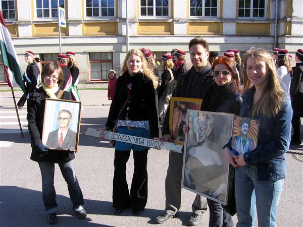 Ometi, nagu võib lugeda Mart Kuldkepi „Veljesto manifestist“, on Veljesto teadlikult midagi palju oksüümoronlikumat: konstruktiivne anarhia, healoomuline kasvaja, üheaegselt tardunud ja fööniksina tõusev, kasvav ja kahanev, isegi selle rahvuskultuursus seisneb suures osas väljanaermises ja mahasalgamises. Kui kellelegi väljaspool ongi suhteliselt mõttetu üritada seletada mõne akadeemilise intiimorganisatsiooni olemust (väärtuslikud hetked organisatsioonis on väga individuaalsed, isiklikud ja sellisena küllalt edastamatud ja arusaamatud kõrvalisele inimesele), siis Veljesto on selles mõttes veel erakordselt allumatu juhtum, ikkagi täiesti amorfne pähkel hammustajale. Kuldkepp sõnastab, et eesti haritlaste ülesanne pole tänapäeval „mitte sisepagulusse kapselduda, vaid tegutseda selle nimel, et rahvuskultuur kui ideaal ja lipukiri parasiitsest ametkondlikust kontekstist lahti haakida“ (lk 14). See on muidugi täiesti hullumeelne ülesanne! Aga pärast Kuldkepi manifesti läbilugemist hakkasin ma aimama, miks isegi maiöö traditsioonilisele akadeemilisele paraadile Tartus ilmub Veljesto alati kui mingi ilmutis, kui midagi täiesti teistsugust ülejäänud organisatsioonidest, kandes lipu asemel Marilyn Monroe’ portreed! No kes ei tahaks Marilyn Monroe’d rõivastest „lahti haakida“! Kogu seda tõsist kultuuriülesannet annab ju lahendada võrdlemisi seksikalt! Guugeldades leidsingi huvitava pildi, kus orgialikus ruumis, mille keskel on põlevale kaminale asetatud WC-pott, keerlevad agni-psühhedeel-erootilises templirituaalis tuntud veljestolased Jaan Malin, Jaak Tomberg ja Jaan Kangilaski! Nurgas aga kõrgub ikoonina seesama maiöö ristikäigult juba tuttav Marilyn Monroe’ häbitu pühapilt! Issand, mis toimub!