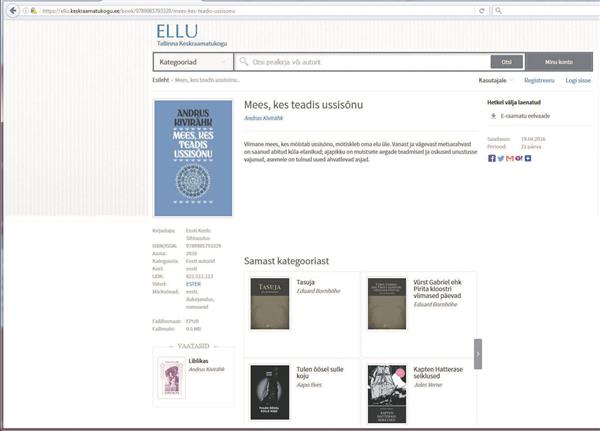 Tallinna keskraamatukogu on endiselt Eestis ainus rahvaraamatukogu, kes laenutab oma lugejatele eestikeelseid e-raamatuid, mille autoriõigus veel kehtib. E-raamatuid laenutatakse e-raamatute laenamis- ja lugemiskeskkonnast ELLU,2 mille peaeesmärk on vahendada eestikeelset kirjandust. ELLU loomise üheks ajendiks oli see, et ingliskeelne kirjandus oli noortele paremini kättesaadav kui eestikeelne kirjandus ja Eesti autorite looming. Nüüdseks on ELLUs endale konto teinud 5270 lugejat (sh õpilased mujal riikides asuvatest Eesti koolidest), kes on e-raamatuid laenanud 45 830 korral. Sellel aastal on 1045 lugejat laenanud e-raamatuid juba 5245 korral. E-raamatute laenutusteenuse nõudlus kasvab aasta-aastalt ning aina enam tuleb meil lugejatele selgitada, miks ELLU e-raamatute valikus ei ole ühte või teist uuemat teost, sh Eesti autori kirjutatud teost.