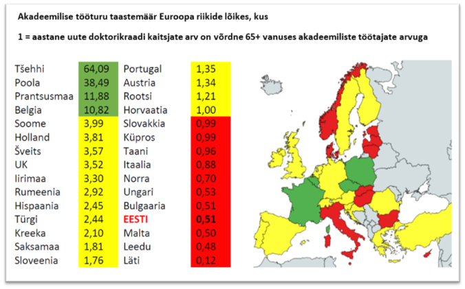 Eestikeelse akadeemilise järelkasvu taastemäär on juba aastaid madal (vt joonist 3) – oleme Läti ja Leeduga Euroopa riikidest kõige kehvemas seisus. 2018. aastal oli 11,1% meie akadeemilistest töötajatest 65 või vanemad, vastaval aastal oli uute doktorite arv 244 ning akadeemilisi töötajaid 4352. Taastemäär seega 244 / (0,111× 4352) = 0,51.