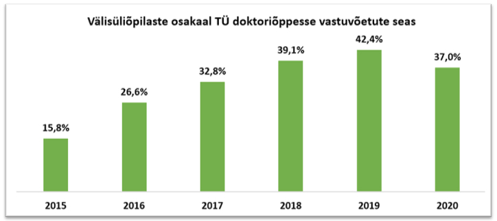 Joonis 2. Välisüliõpilaste osakaal TÜ doktoriõppesse vastuvõetute seas