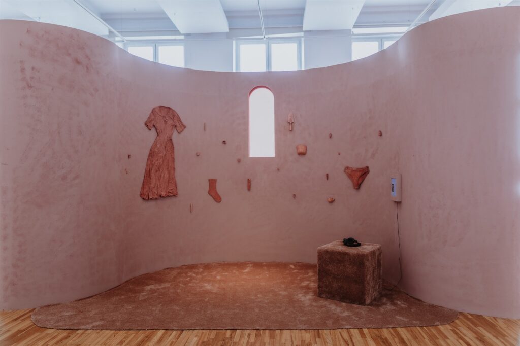 Sealsamas mutantide seeria kõrval võtab suurema osa näituse pinnast enda alla Jancise teine teos, matt-roosa installatsioon, silmale pehme ja kutsuv, mille peale on sama värviga kinnitatud-kleebitud aluspesu, huulepulk, ridikül jms – kõik nii-öelda naiselikud – esemed. Tegemist on kaasava installatsiooniga, mis on loodud koostöös Tartu ülikooli etnoloogide Ester Bardone ja Eeva-Ruth Niitvägiga. Istudes selle pehmele kuubik-toolile, jalad pehmes beežjas vaibas, saab kuulata naiste lugusid oma emadest, sellest, mis tähendab olla tütar või ema, ning seda esmalt nendega seotud esemete kaudu. Teos kutsub üles mõtlema ka oma ema ja tema tähenduslike esemete peale, mis n-ö teevad temast tema, kellegi emast just tema ema. Mind üllatas, et kõik lood, mis räägitud pigem sellisel pehmel-mahedal häälel – on helged ja positiivsed. Kas tõesti pole intervjueerivatel kellelgi olnud oma emaga ka halbu ja negatiivseid kogemusi? Sestap mõjus tasakaalustavalt Flo Kasearu vanaema nõudlik ja käredat tähelepanu nõudev hääl suletud kardinate taha jääva videoinstallatsiooni varjust.