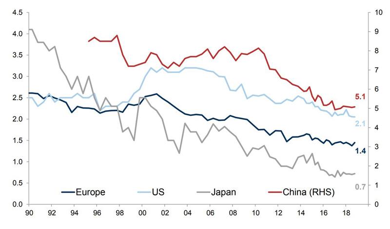 Miks on lootused pandud andmekogumisele ja tehismõistuse arendamisele? Paradoksaalselt ei ole kogu selle sajandi IT-progress toonud kaasa tootlikkuse kasvu kiirenemist, pigem vastupidi: globaalne majanduskasv on pidevas langustrendis, teiste sõnadega, majandus küll kasvab, aga üha aeglasemalt.