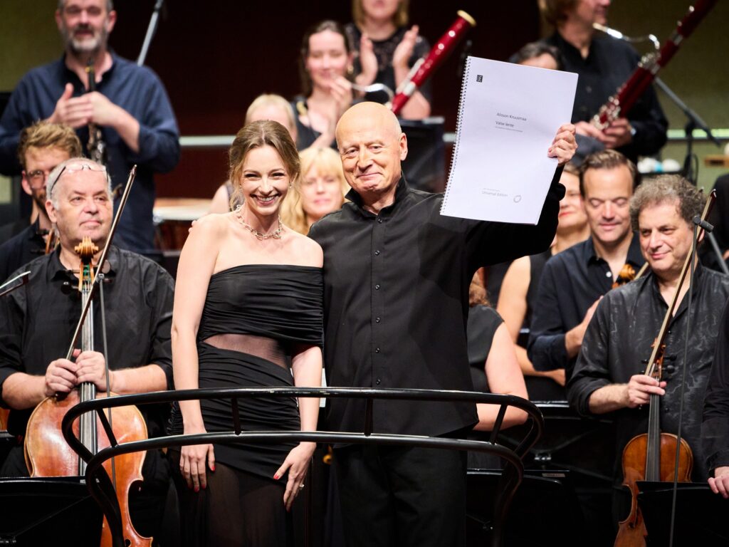 Alisson Kruusmaa ja Paavo Järvi Eesti Festivaliorkestri ees pärast Kruusmaa uudisteose „Valse lente“ esiettekannet Pärnu muusikafestivalil.