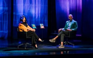 Kirjandusfestivalil Helsinki Lit lastakse nimekad soome kirjanikud lavale ainult selleks, et nad intervjueeriksid nimekaid välisautoreid. Pildil Golnaz Hashemzadeh Bonde Rootsist ja Jani Toivola Soomest.