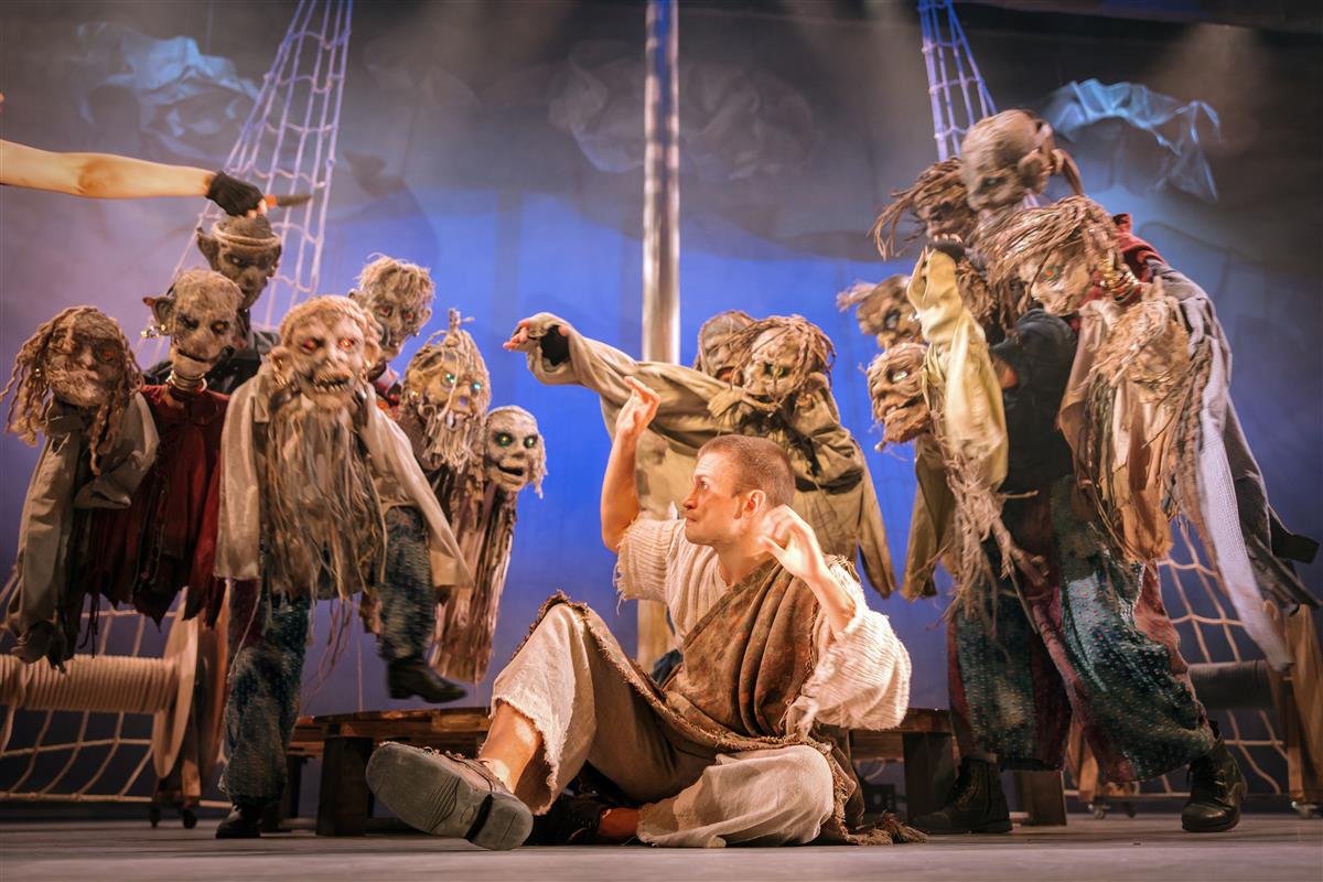 Laval mõjuvad veri, surnukehad ja vägivald palju traumeerivamalt kui raamatus. Taiplik on mereröövlite eluolu lavapildis leevendada, kasutades nukke ja võitluse kujutamisel selle matkimist. Heakskiitu väärib otsus mitte tarvitada valju pauku tegevaid revolvreid. Kõmin selle asemel säilitab lasu efekti, pehmendab ehmatust ning kasvatab või vastupidi kärbib pinget vastavalt narratiivi ülesehitusele ja vajadusele. Sel moel vallandavad ja süvendavad hirmu ja kartust hoopiski valgus- ja helilahendused. Kõik heliefektid täiendavad dialoogi, stseene ja õhustikku, valitud muusika rikastab ning aitab meisterlikult tüürida publiku emotsioone soovitud suunas. Neid kombineeritakse varjude ning Trei kurjakuulutavate kirjelduste ja kõnnakuga – kõik see kokku süvendab üldist tumedat meeleolu.