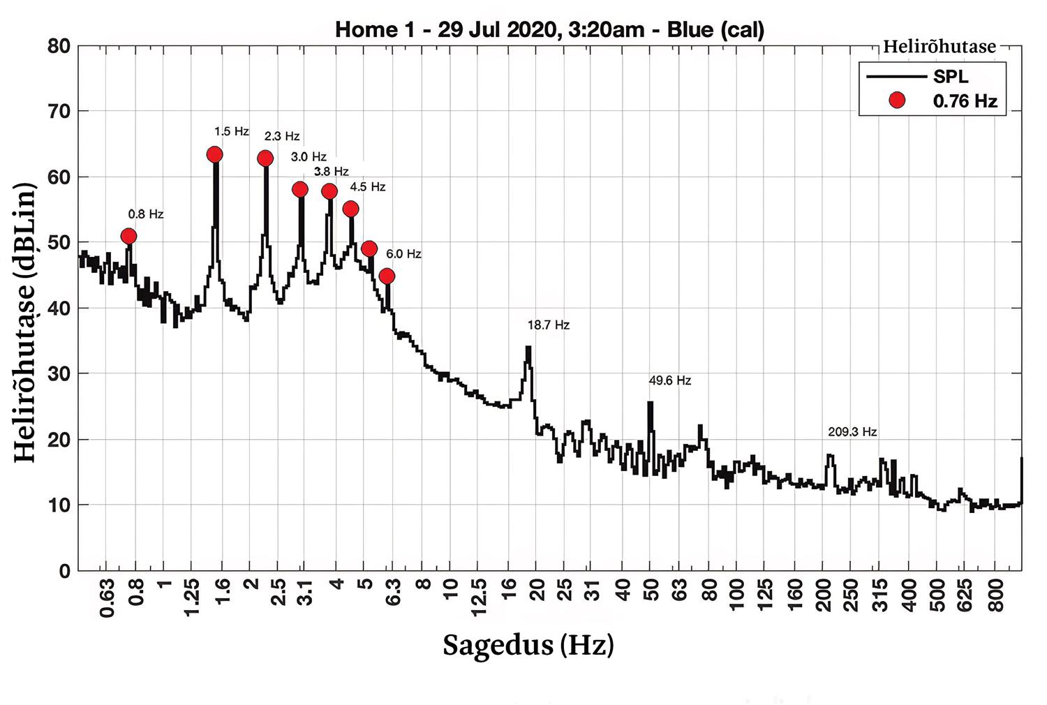Joonise horisontaalteljel on 1/36 oktaavise täpsusega registeeritud helisagedusvahemikud. Oluline on rõhutada, et tervisemõjude hindamiseks laialdaselt kasutatav 1/3 oktaavise täpsusega sagedusvahemike eristamine pole tuugenite tiivikulabadest tingitud infraheli impulsside registeerimiseks piisav.