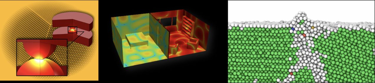 Näited TÜ tehnoloogiainstituudi simulatsioonitehnoloogiate tuumiklabori pakutavatest lahendustest. Vasakult multsikaala simulatsioon atomistlikus skaalas, akustikasimulatsioon lõplike elementide meetodil ja molekulaardünaamika.