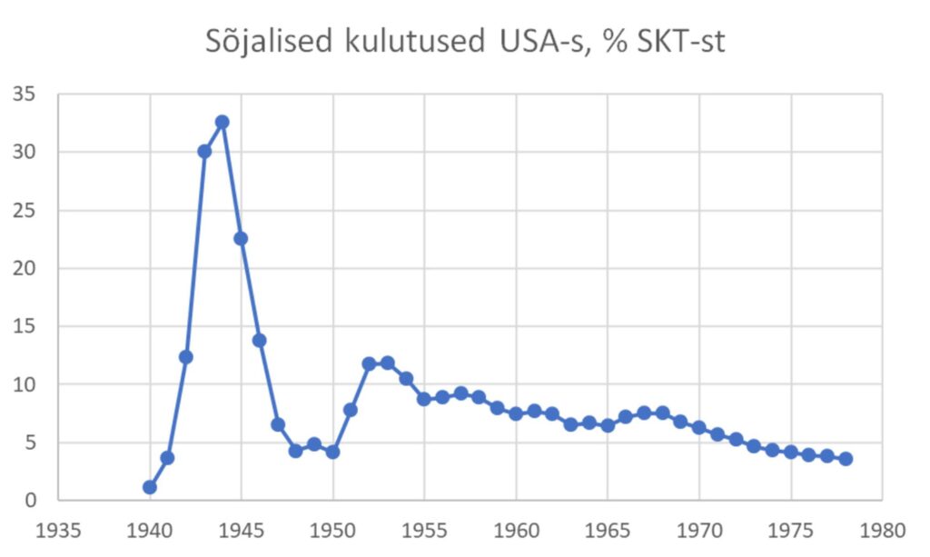 Teise maailmasõja aastatel kasvasid sõjalised kulutused kolme aastaga kokku 28,8% võrra SKTst. Vahetult pärast sõda (1948–1950) sõjalised kulutused langesid põhja, sest võidueufoorias arvati, et sõjaoht on seljataga. Varsti ilmnes üllatavalt, et Nõukogude Liit polegi liitlane, vaid vaenlane. Siis kasvasid need kulud kahe aastaga 7,5% võrra SKTst. Kas USA valitsus võttis selleks laenu?