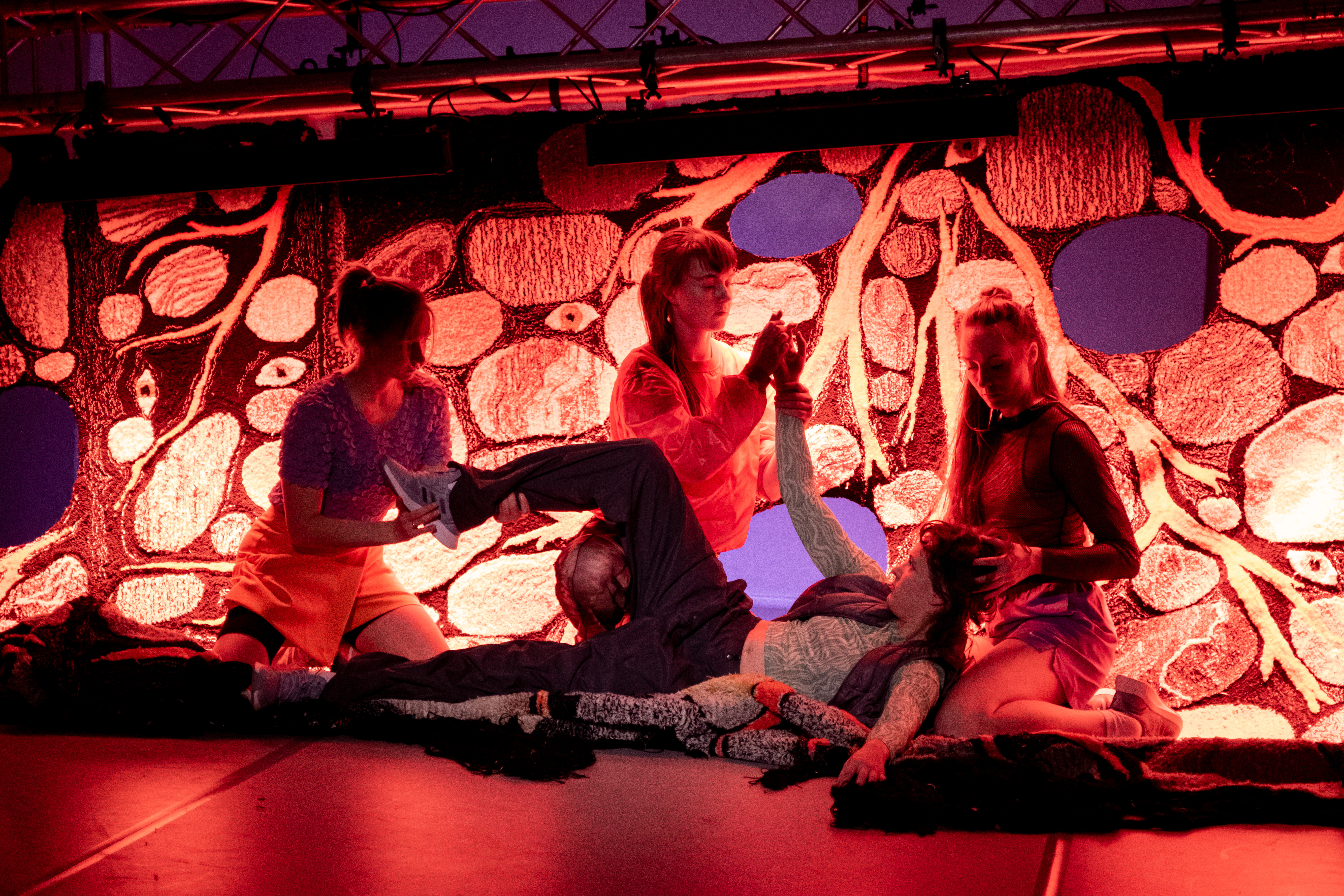 Kui miski on selles lavastuses sõna otseses mõttes jämedakoeline, siis on seda Laura Põllu spetsiaalselt lavastusele tehtud vaip. Tagaseinal poolel kõrgusel rippuv suur vaip. Raske käsitöövaip. Mõjukas artefakt. Tehislike aukudega vaip, mis ulatub põrandale, sealt veel edasi ja kutsub lavastuse kestes tantsijad enda rüppe. Augud on veel kutsuvamad, nii väga tahaks turisti kombel oma pea sealt august läbi pista ja pilti teha. See oleks üks vahva jant, saaks pulli. Lavastus seda banaalset võtet ei paku. Ainult kutsub ja käivitab, annab lubaduse, mis täitub, aga mitte iga vaataja peas.