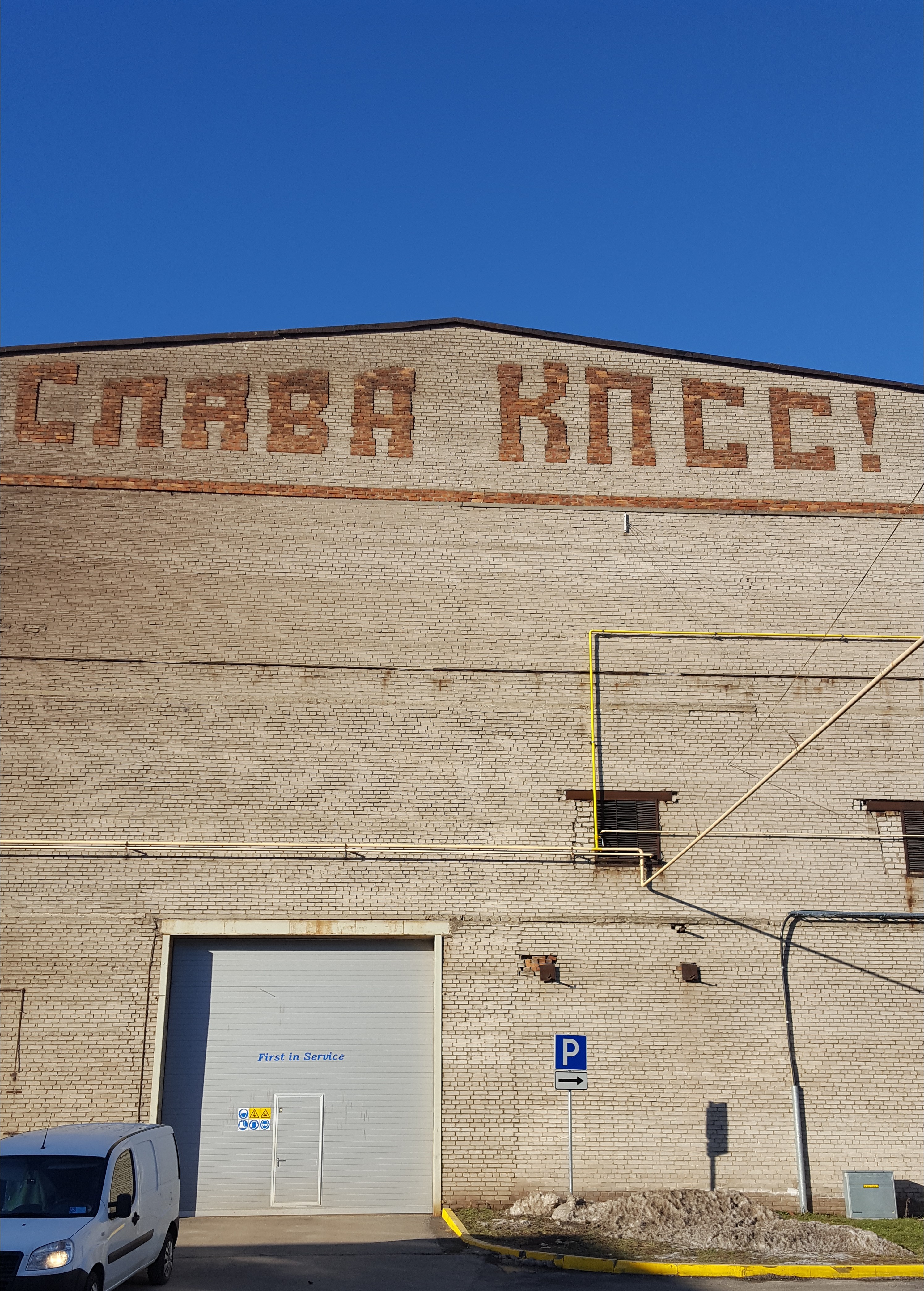 Veel 2018. aastal leiab Eesti Vabariigi pealinna ühes populaarsemas ärilinnakus, kunagises Dvigateli kvartalis, sõnumeid Nõukogude ajast. Keeleseaduse rikkumist ei ole: eesti keel on esikohal (maja esiküljel) ja tõlge vene keelde on teisel pool maja.