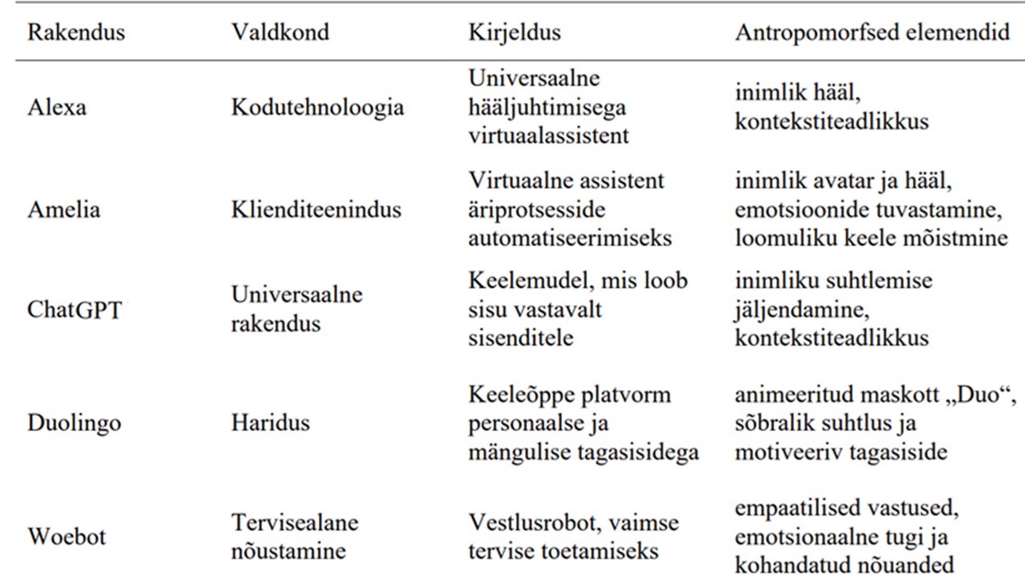 Tabel. Antropomorfsed elemendid TI-rakendustes