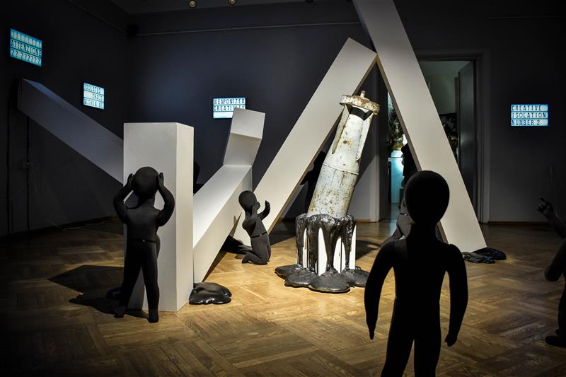Inimesi on apokalüptilistel maastikel rohkem kui loomi. Tegelikult peaks selles suhtes saavutama tasakaalu, nagu kutsub üles ühes ruumis asetsev aju. Aju on purgis, pool käärudest on tal asendatud samblaga ja pool on puhas ja valge nagu värskelt pesumasinast tulnud. Aga seda aju ei kuulata eriti. Inimesi on väljapanekus üha rohkem ja rohkem, nad on seintel piltide peal, võidukate kujudena loomade evolutsioonilise jada ees ja sulanud maskide taga. Maskid on eelajaloolistest aegadest signaliseerinud sama palju, kui need varjavad: maski kantakse, et signaliseerida (tervise)vagadust, superkangelasena, et hoida sotsiaalset distantsi, aga ka selleks, et näidelda jne. Maskid osutavad alati teistsugusele tegelikkusele.