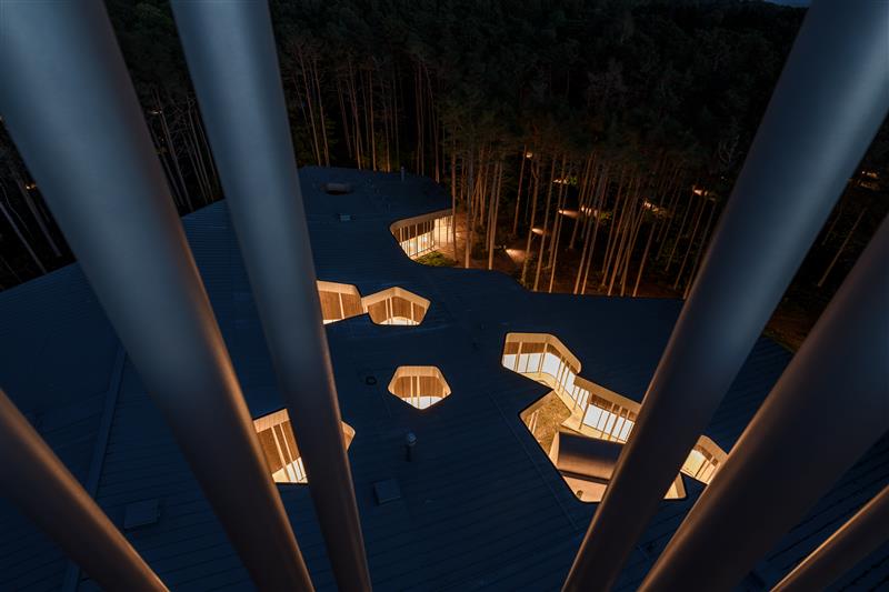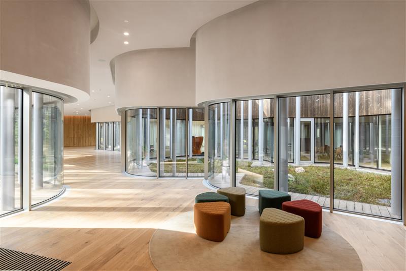 Ja tulemus on keskus, mis on kõike muud kui tavamõistes hoone: seda iseloomustavad looklevad nurkadeta ruumid, sujuvad üleminekud, hubasus, mõtlikkus ja positiivsus. Ruum voolab nagu hea heliteos. Klaasseinad ja avatud sisehoovid, läikiv plekk-katus, muutuva läbimõõduga tundlikult paigutatud erinevalt helisevad metallpostid – justkui liiga lihtne ja juba mujal kogetud, aga ei. Ühest ruumiosast teise tuleb liikuda nagu metsas, kus peab arvestama puude ja põõsastega, siin aga viisnurksete sisehoovidega – siingi pole otse minek kõige otsem tee.