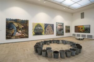 Omamoodi dialoogi moodustavad Per William Peterseni installatsioon „Maaelu evolutsioon – muutumise protsess“ (2015) ja Mare Mikofi kollane installatsioon „Väikese kuusepuu monument“ (2017). Mõlema teose rõõmsasse kollasesse koloriiti on tunginud sisse ähvardavalt punane värv. Peterseni punastel suuskadel kollase monstrumi nägu koosneb vaid õgimishimulisest ekskavaatorikopast.