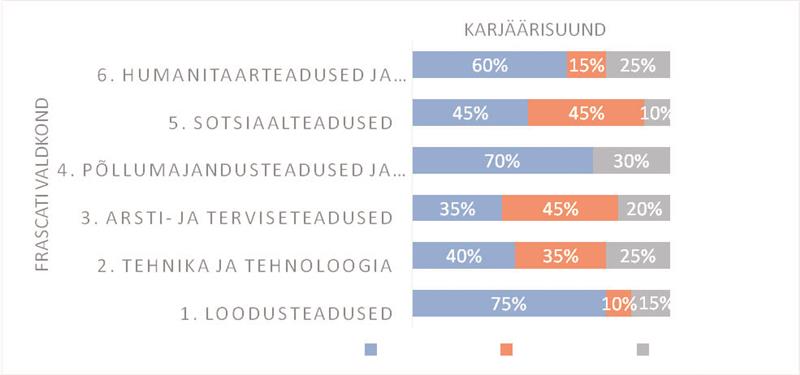 Näiteks arsti- ja terviseteaduste valdkonnas kolme aastakäigu doktorite karjääritee analüüs näitas proportsiooni 35/20/45 – 35% jätkab täiskoormusega akadeemilist karjääri, 20% astub täielikult mitteakadeemilisele tööturule ning 45% püüab osakoormusega ühendada akadeemilist ja mitteakadeemilist maailma (näiteks käiakse arstitöö kõrvalt osakoormusega ülikoolis õppetööd tegemas). Laias laastus püsib samalaadne olukord ka sotsiaalteadustes. Toome võrdluseks loodusteadused. Nimelt kehtib siin hoopis vahekord 75/15/10 ehk 75% jääb ülikooli, 15% liigub mitteakadeemilisele tööturule ja 10% püüab kombineerida. Kui vaadelda olukorra dünaamikat, siis võrreldes 2000. ja 2005. aasta lõpetajatega liiguti 2010. aastal juba palju rohkem mitteakadeemilisele või kombineeritud suunale ning seda kõikides valdkondades. Intervjuude käigus toodi peamiste põhjustena kas akadeemilise sfääri töökohtade ammendumine (vabu kohti parajasti ei olnud), akadeemilise töökeskkonna sobimatus (nõuded) või saadav töötasu.