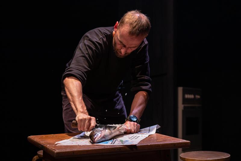 Ega ei vaata ju saalis kella, et kui kaua see kala roaks rookimise rituaal kestab. Ei raatsiks pilku sekundi murdosakski langetada. Kestku aga! Põnev on jälgida, kuidas Märt Avandi Mees oma kalale keskendub, pühendub. Leidub teatris sihukesi õndsaid hetki, mil see päris-päris tegevus muutub lavalises kontsentratsioonis sõrendatuks, kujundlikuks. Hõbesoomuseid lendab Mehe noa alt. Tore oli moment, kui sidrun kukkus laualt ja veeres otsustavalt saali poole, kuni Mees napsas ta kinni viimasel viivul lava servast, kostitades esirida kuratliku pilguga: mida teie siin nüüd lootsite!