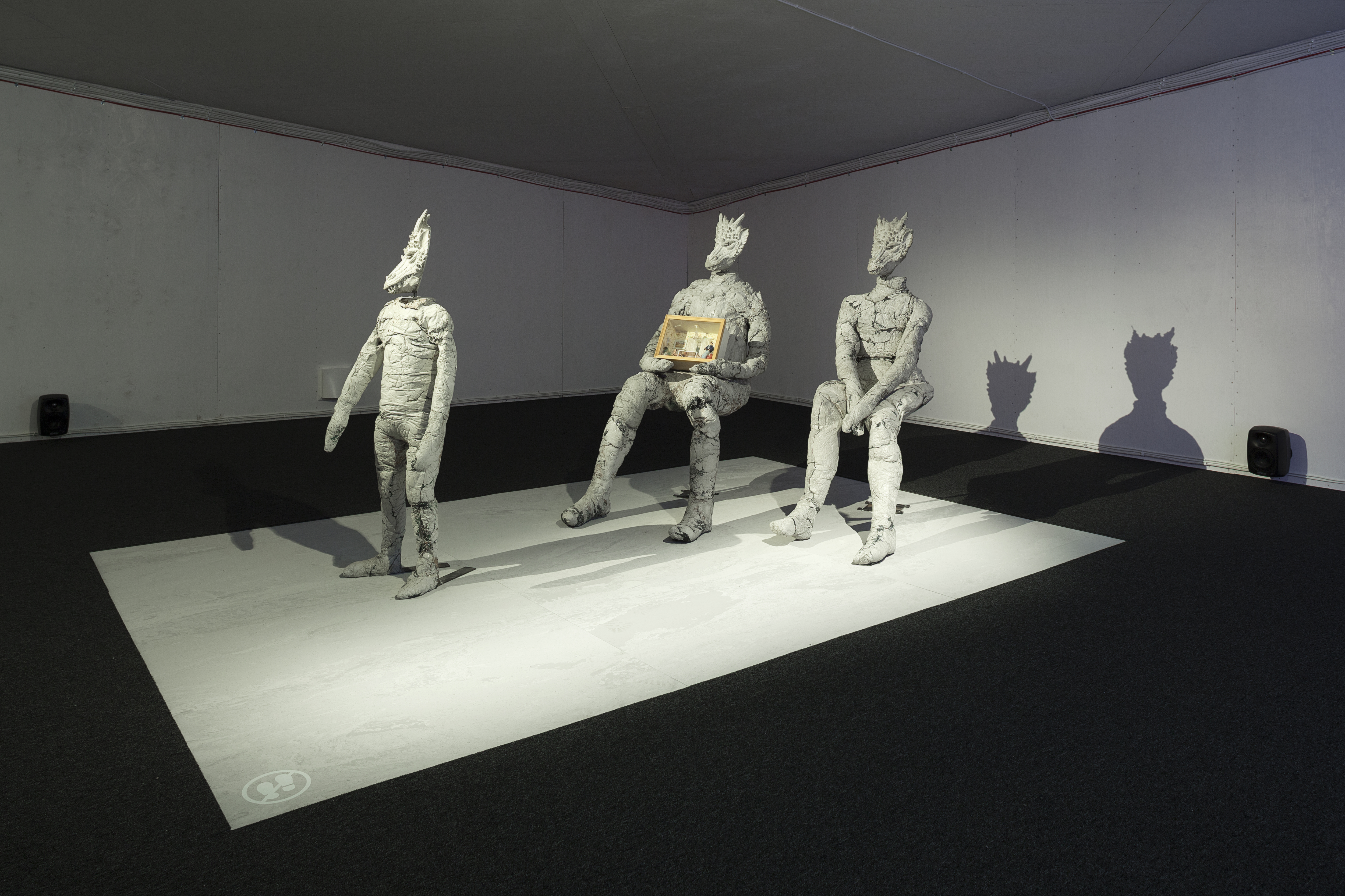 Avapidustustel algas giidi tuur näituse tagumisest otsast, sealt, kus lääpas laega näitusesaali kõrgus tuntavalt alla kahe meetri langeb. Nii või naa, kas siis avatöö või lõpetajana, istub seal krokodillipeaga olendite näidisperekond – kas isa, ema ja lapsuke Gena? Tundub, et Edith Karlsoni installatiivse skulptuurigrupi kirjeldamine viiks varem või hiljem rappa või ülemeelikusse groteski. Näidisperekond püüab küll pildikastis eksponeeritud pärisinimeste elu imiteerida, kuid sisalikud jäävad sisalikeks.