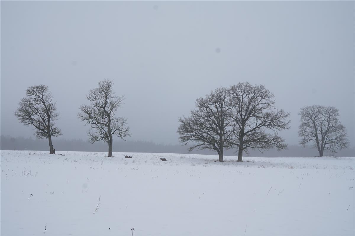 Koplimetsa uuem osa Uudeküla. Hääbunud külast on alles põllul laiuvad tammepuud.