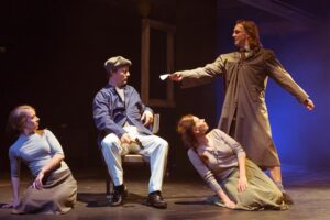 Teksti, õigemini inimhääli sisaldab lavastus vähe ja enamasti ei vii need tegevust edasi. Või kui viivadki, siis ainult kukesammu kaupa. Pigem vastupidi: tühjade fraasidena ja olmemürana hääled pigem vastanduvad tegevusele („Milline mees! Väga ilus! Võrratu mees!“). Bufonaadlikult kiire kostüümide ja rollide vahetus sünnib animafilmiliku efektsusega.