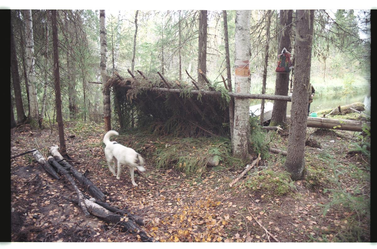 Jevgeni Tšalanovi koer Tšip ja varjualune ööbimiseks Kuk-ju jõe ääres.