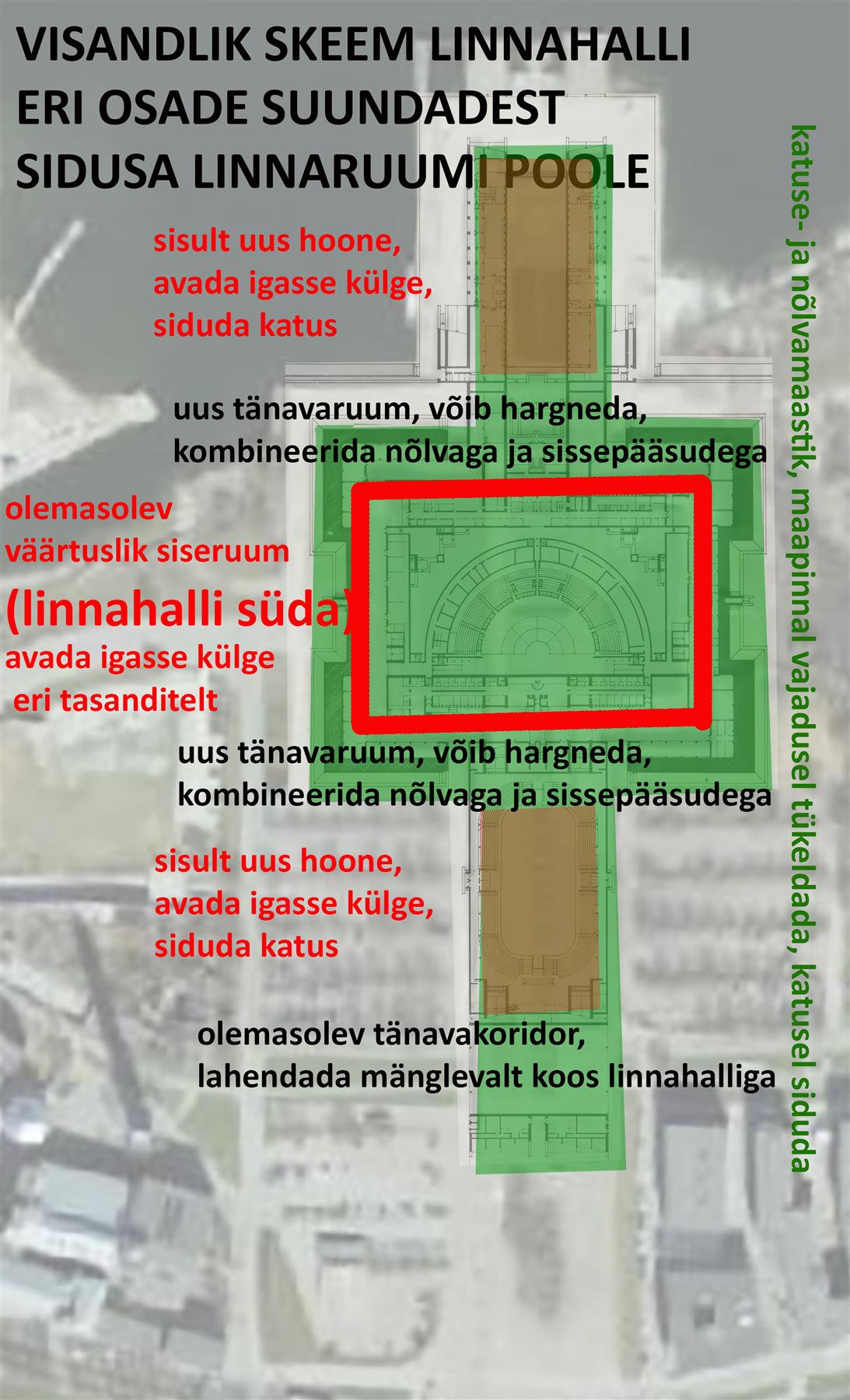 Linnahall on nii suur süsteem, et selle uued ja vanad osad vajavad kokku lausa mitut arhitektuurivõistlust, aga panen ette alustada praegu hoone väliruumiga sidumise võistlusest. Usun, et võistlustingimuste koostamise koostöö käigus ja pärast tulemuse tõlgendamisel oleks ka muinsuskaitse valmis paindlikult mõtlema. See võistlus ei peaks olema lihtsalt ideede pildumine nagu kõnealune, vaid läbitöötatud ülesandega realistlike ruumilahenduste otsimine koos võimalike kasutajate, muinsuskaitse, inseneride jt.