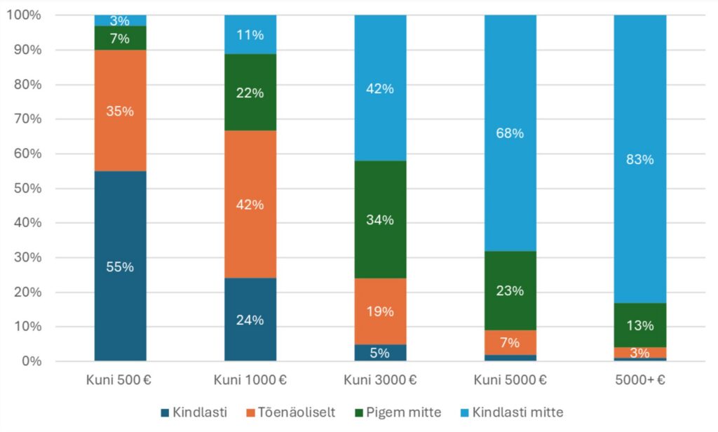2022. aastal küsisime EUROSTUDENTi uuringus üliõpilastelt, kas juhul, kui ajal, mil nad kõrgkooli astusid, oleksid kõrgkooliõpingud olnud Eestis kõigile tasulised (eri valikutena antud summade ulatuses), kas nad oleksid Eestis õpinguid alustanud. Valiku „kuni 3000 eurot õppeaastas“ puhul märkis koguni 76% üliõpilastest, et nad „pigem mitte“ või „kindlasti mitte“ ei oleks sellise õppemaksu puhul Eestis kõrgkooliõpinguid alustanud, sh neid, kes märkisid „kindlasti mitte“, oli 42% (vt ka joonis).