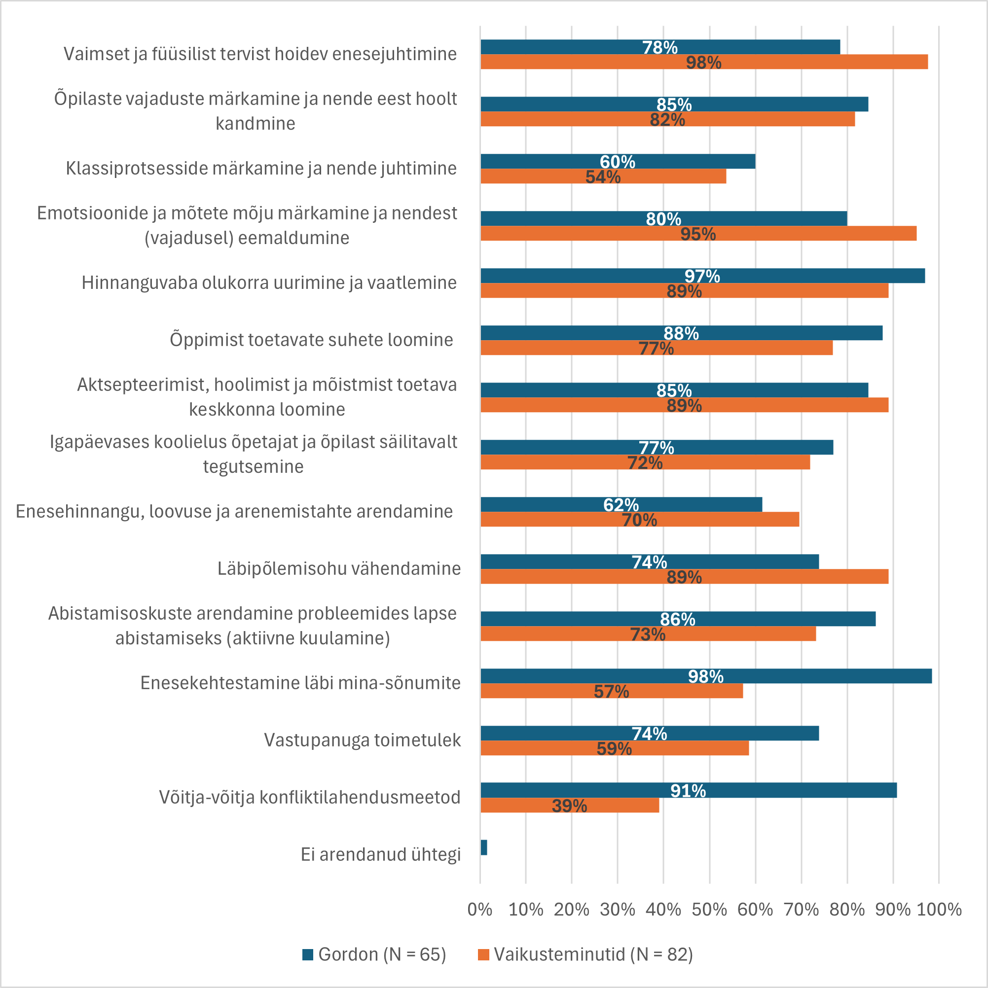 Koolitusrühmade (Gordoni koolitus (N = 65) ja Vaikuseminutite koolitus (N = 82)) hinnang sellele, milliseid õpitud oskusi nad arendasid koolituse käigus. Esimesed seitse õpitud oskust on seotud Vaikuseminutite ja järgmised seitse Gordoni koolitusel õpitavate oskustega. Küsitluses ei olnud märgitud, millised õpitud oskused on seotud millise koolitusega.