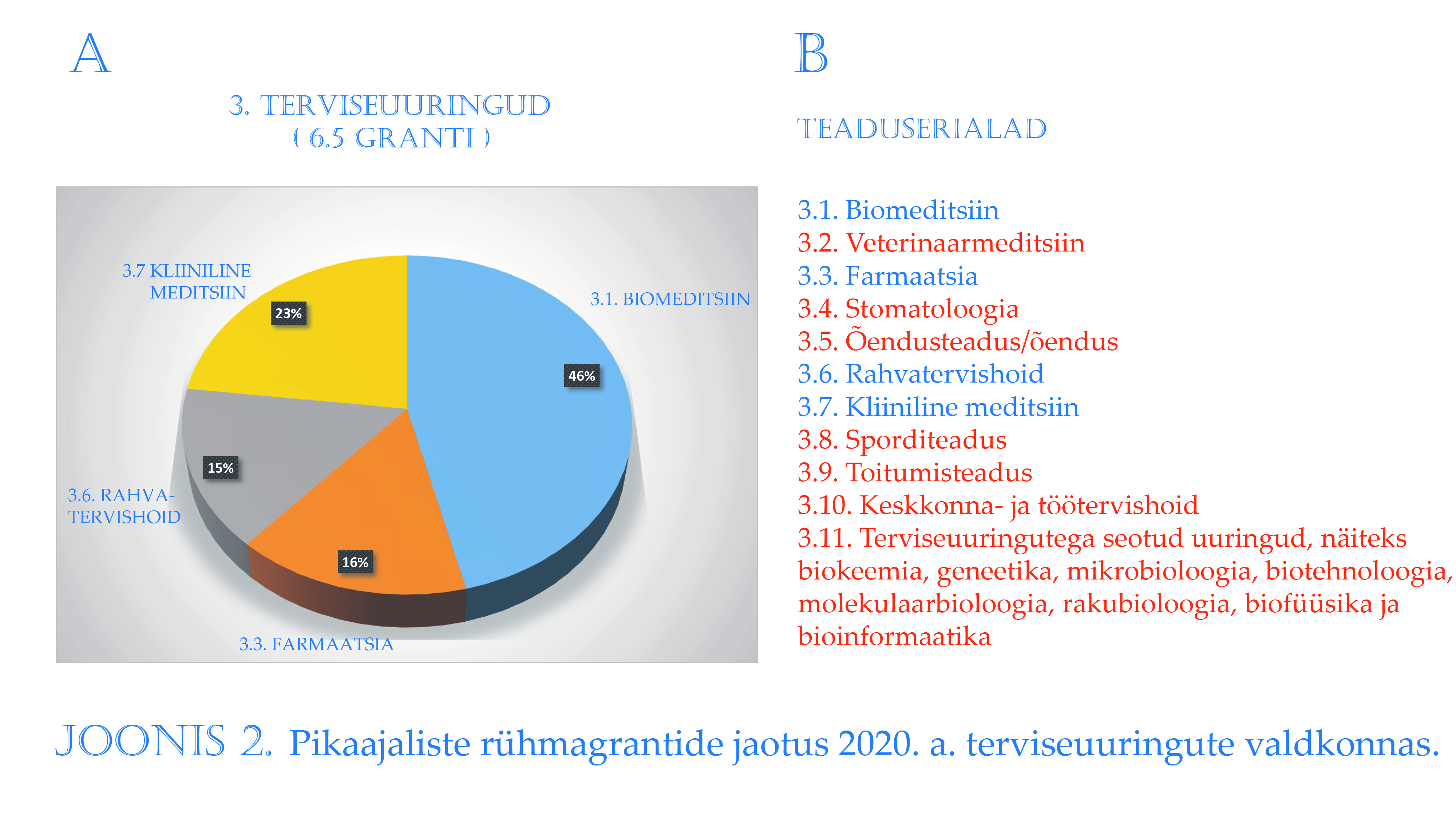 Joonisel 2 on terviseuuringud. Kõigepealt torkab silma grantide vähesus, kuid need vähesed on enam-vähem ühtlaselt jaotunud. Ka siin on toodud teadusharude täielik loend ja punasega märgitud valdkonnad, mida eelmisel aastal pikaajaliste rühmagrantidega ei rahastatud. Neid valdkondi on palju. Kas mitte liiga palju? Kas oleme midagi unustanud?