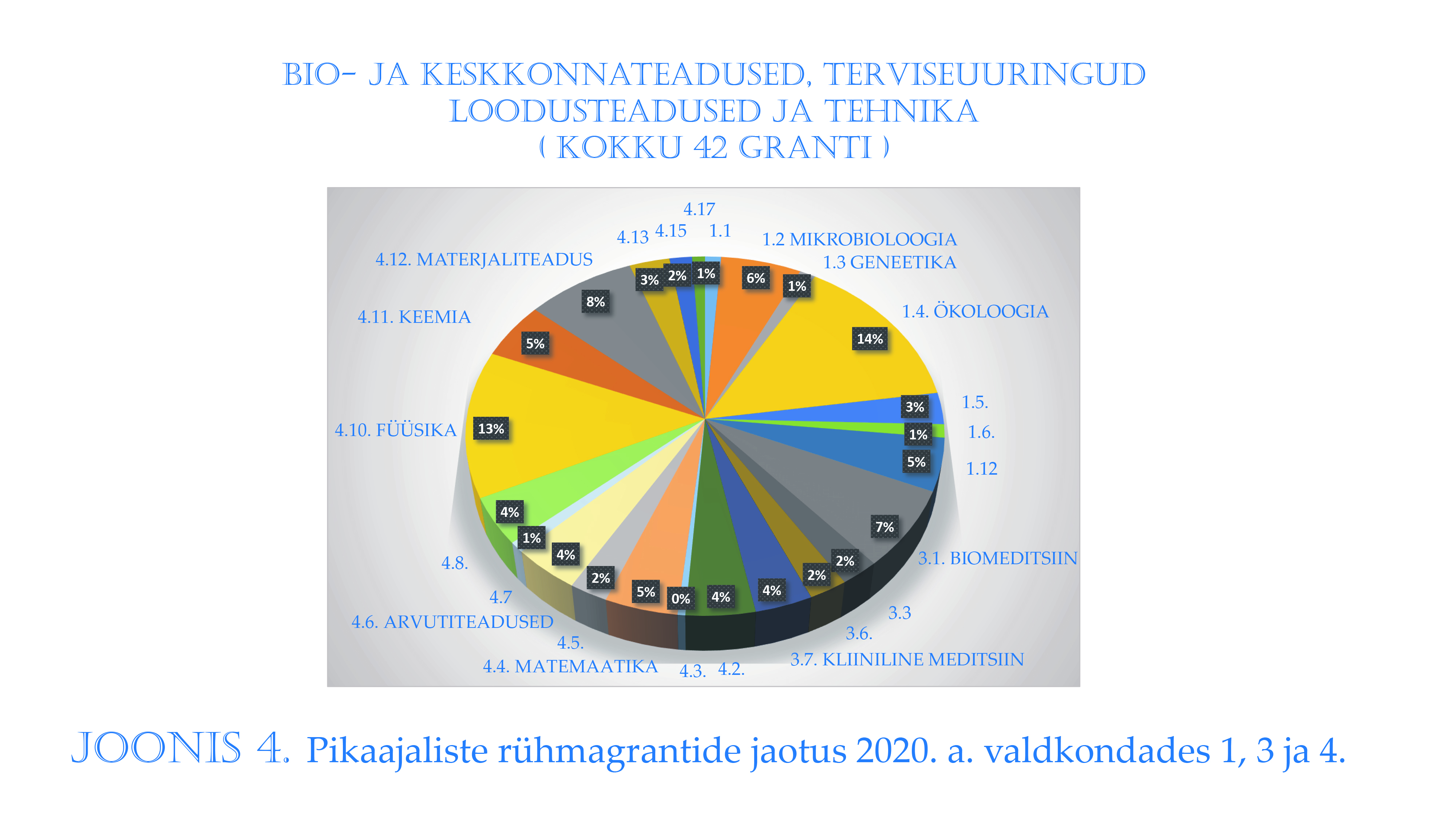 Esmalt 1. valdkond bio- ja keskkonnateadused, kus eraldatud teadusrahastuse (teadusgrantide) jaotus on esitatud joonisel 1.  Toodud on teadusharude täielik loend ja punasega on märgitud valdkonnad, mida eelmisel aastal pikaajaliste rühmagrantidega ei rahastatud.