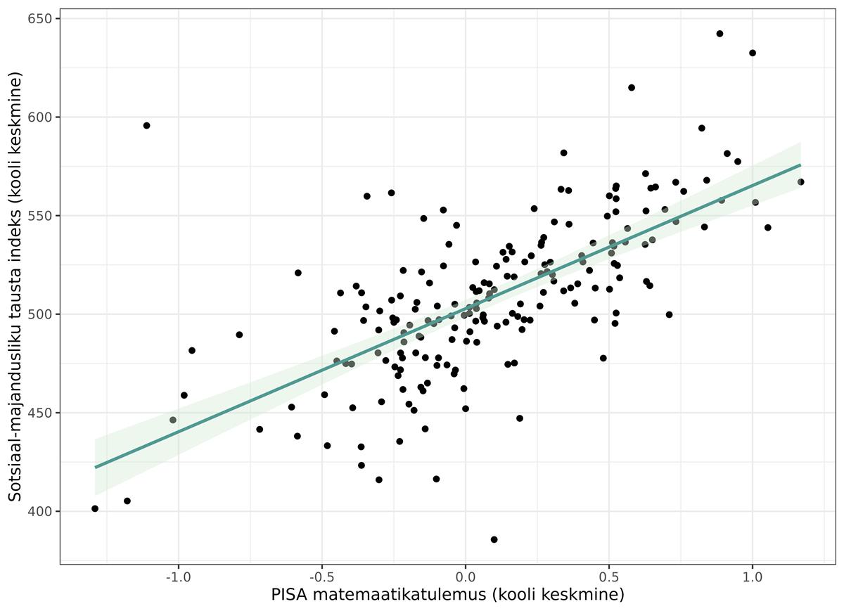 Ka matemaatika testi tulemuste ning õpilaste sotsiaal-majandusliku tausta näitaja vahel oli (nagu tavapäraselt) positiivne korrelatsioon ehk siis paremal sotsiaal-majanduslikul järjel õpilased saavad koolis paremini hakkama. Seda suundumist on teaduskirjanduses järjepidevalt kinnitatud. Positiivne korrelatsioon ilmnes ka koolide keskmiste tasandil: koolid, kus on keskmiselt kõrgem sotsiaal-majandusliku tausta indeks, said paremaid keskmisi tulemusi ka PISA 2022 matemaatika testis. Teisisõnu, test toob esile haridusliku ebavõrdsuse ja kihistumise nii õpilaste kooli heaolu näitajates kui ka saavutustesti tulemustes. Allolev joonis näitab, et nii nagu erinevad koolide keskmised PISA testi tulemused, erinevad ka nende koolide õpilaste keskmised sotsiaal-majandusliku tausta indeksid ja need näitajad on omavahel küllaltki kõrgelt positiivselt korreleeritud.