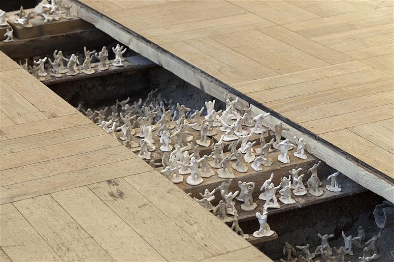 Camille Laurelli installatsioon„Mäss“, kus põrandaaugus pesitsevad väikesed savist mehikesed.