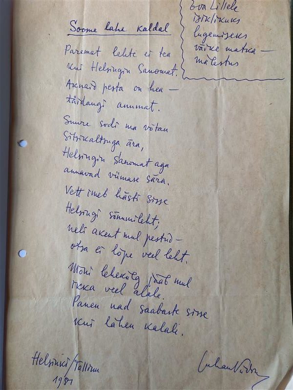 Enne nüüdset olen Eva Lillega Helsingis kohtunud vaid paaril põgusal korral, nii et olen juba ette tänulik, et ta usaldab mind oma kodus (ühena seal viibinud pikas-pikas eestlaste rivis) vastu võtta ja on valmis meenutama ning jutustama. Või kas oskasime olla valmis selleks, et kohtume laupäevast laupäevani ning vestleme iga päev viis või enam tundi? On väga põnevad ja intensiivsed päevad. Üks soomlanna viib mind väga sügavale minu enda kultuuri. Mu märkmetesse sugeneb üha rohkem hüüumärke ja allajoonimisi. Märkusi, mida hiljem üle lugedes hakkan omaette muhelema või kipun heldima. Aga lugu ei tohi tulla liiga emotsionaalne, seda rõhutab Eva Lille mitu korda.