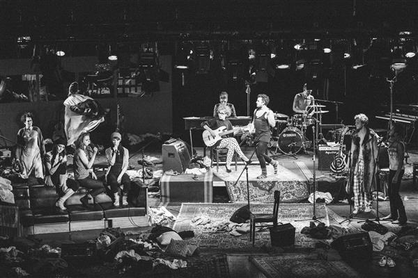 „Veider orkester“ on Adrian Giurgea kolmas Eestis tehtud lavastus (eelmisel aastal jõudsid lavale „Armastus ja informatsioon“ Vene teatris ning „Alustame algusest“ Vabal Laval), nii et mõningaid üldistusi võib juba teha. Tundub, et Giurgea lähtub lavastades vormist, mis formuleerub enne proove ja kuhu näidend proovide käigus sisse pakitakse. Vormi all ei pea ma silmas ainult välist (kuigi ka kujundus on Giurgea lavastustes jõuliselt tähenduslik), vaid ka n-ö atraktiivset konksu, millega püütakse publikut näidendi külge haakida. Nagu „Armastuse ja informatsiooni“ lumivalge pöördseintega lava, kus asjatavad koos eesti ja vene keelt kõnelevad tegelased (ja näitlejad), ning „Alustame algusest“ teraapiatoana toimiv proovisaal (see on, tõsi, näidendi autori ette antud), on ka „Veidra orkestri“ lavaruum jutukas: enamiku ruumist täidab lava laval, kus pidevas ooteseisundis pillid, lisaks eeslaval üks diivan ja tagalaval helistuudio. Kuigi Jarek Kasari kirjutatud lood on mõnus kuulamine (nähtud etendusel läks siiski palju halva helitehnika nahka), pole Giurgea suutnud bänditegemist (vabandan, lavastuse pealkirja kohaselt ikka orkestri – veel üks näide lohakast mugandamisest) näidendi looga loomulikult siduda ja nii seisavad pillid laval enamjaolt tolmu kogudes. Eks ta üks veider muusikaline kommuun ole, kus kunagi proovi tegemata vaid esinemisteks pillid haaratakse.
