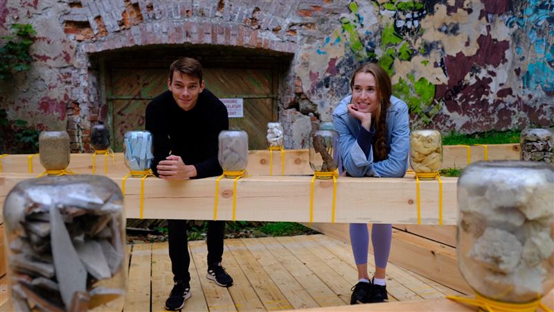 Florian Betati ja Marija Katrīna Dambe parasiitarhitektuuri väikevormi „Linna-aarete raamatukogu“ juures. Installatsiooniga linnafestivalil „Uit“ tõmmati tähelepanu tühjale hoonele ja selle taaskasutamise potentsiaalile ning näidati, et ringmajandus on võimalik ka ehitussektoris.