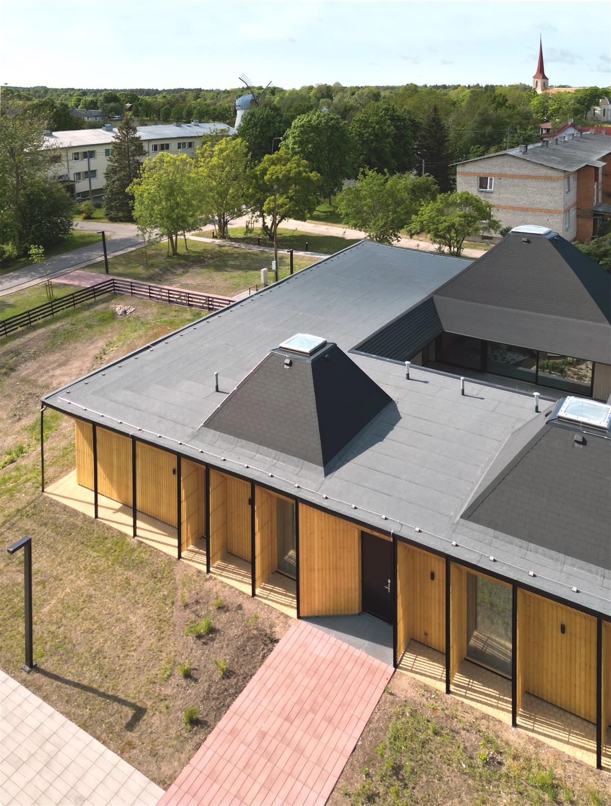 Üks seda laadi projekt, mis testis konventsionaalseid ootusi arhetüüpsele eestilikkusele, oli näiteks Viimsi vabaõhumuuseumi külastushoone konkursitöö (2021). Kompaktse maja ilmes domineerib paks rookatus nagu rehemajal muiste, kuid see on ootamatult amorfse lainetava vormiga, laskudes kohati maapinnanigi. „Tegelikult on see lahendus mitmete Eesti taluarhitektuuri arhetüüpsete viidete summa,“ selgitab Karli. „See on ühe-ruumi-maja, mille konstruktiivne struktuur tuleneb tegelikult püstkojast. Tüpoloogia poolest teatud mõttes nagu telk ehk üks suur hall, kuhu sai mahutada kontori, muuseumiosa, külalised ja muu. Meile tundus, et mida vähem nii-öelda vormi teha, seda parem – see on maja, mis ongi justkui ainult katus ehk täisring, millelt on ootamatult mõned servad ära lõigatud. Samas on tal siiski kergelt eristuv ja tähelepanu nõudev olemus olemas, mingi ikoonilisus kindlasti. Aga see küllap sai ka saatuslikuks: tellija ilmselt soovis, et ikoonilisse rolli jääksid siiski ainult ajaloolised hooned.“