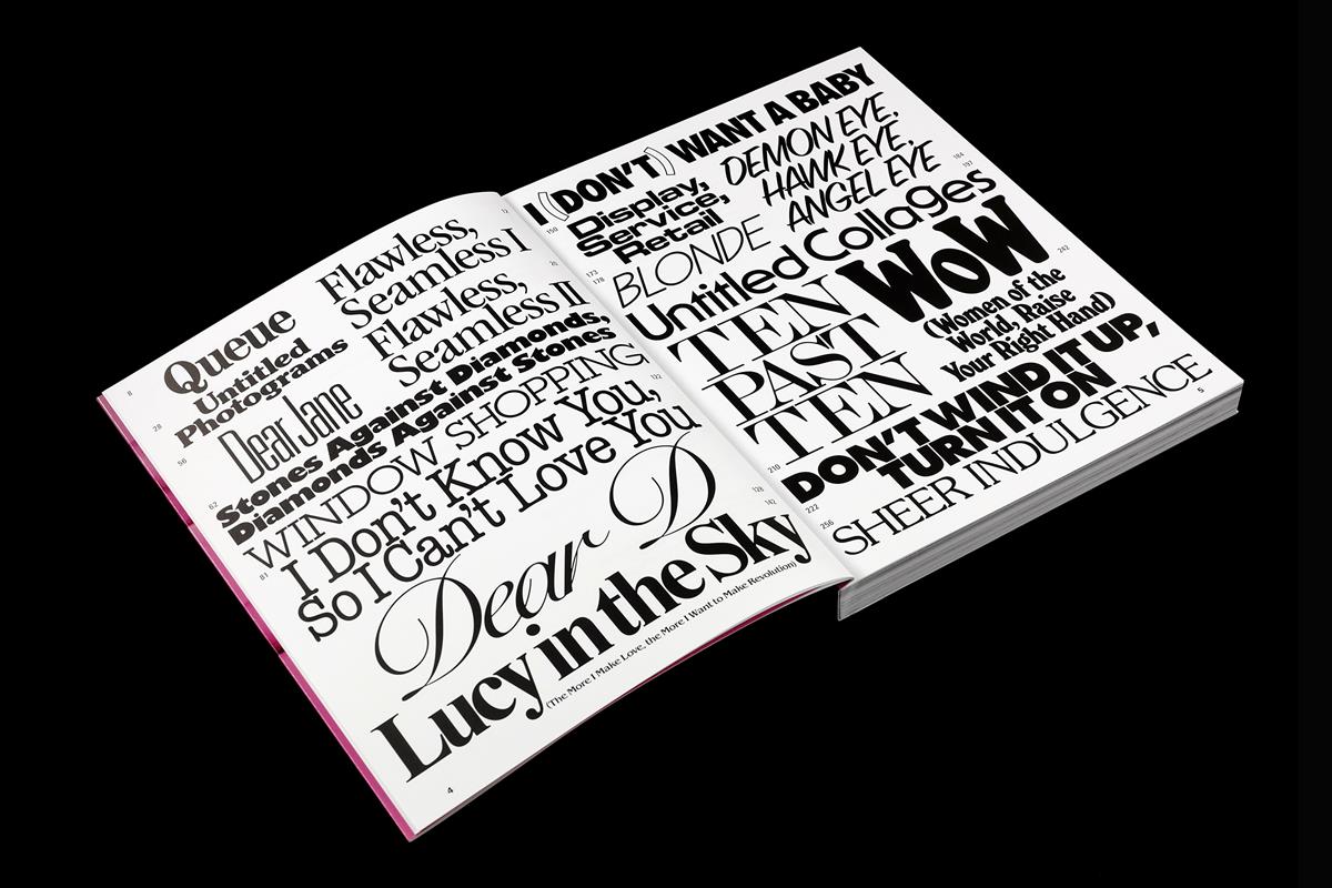 Sisukorras on mängitud teoste ja projektide pealkirjades mitme fondiga, andes sellega ülevaate, milliseid identiteete on teostega nende valmimisajal tahetud edasi anda. Trükises on kasutatud 22 fonti, pealkirja fondina aga märkamatuks jäävat klassikalist Universi (1957). Raske on ette kujutada, et mõnel teisel graafilisel disaineril oleks selline koondamise, ülevaate ja teoste tõlgendamise võime. Indrek Sirkel on teinud Marge Monkoga koostööd kaua aega: ta on kujundanud ka kunstniku kaks eelmist trükist „Don’t Wind It Up, Turn It On“ (2016, samuti koostöös Laura Tootsiga) ja „WoW (Maailma naised, tõstke oma parem käsi)“ (2018).