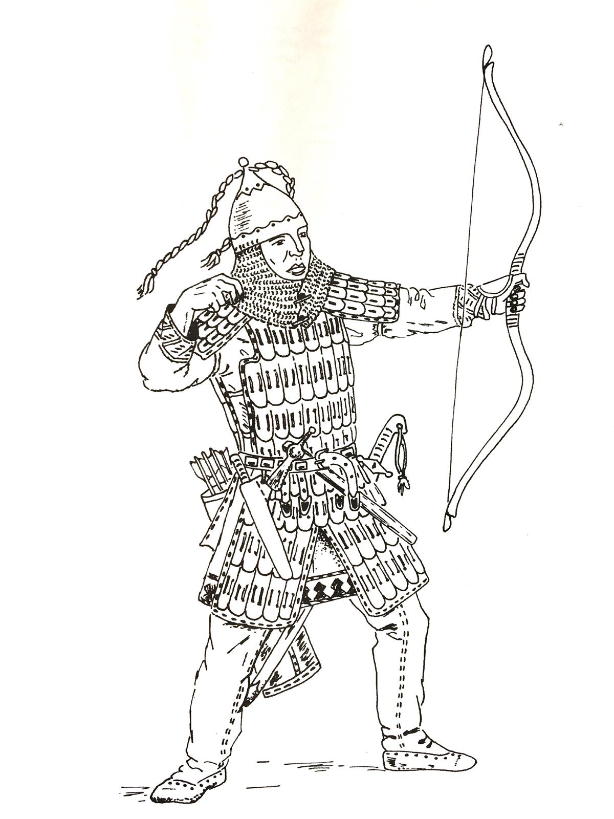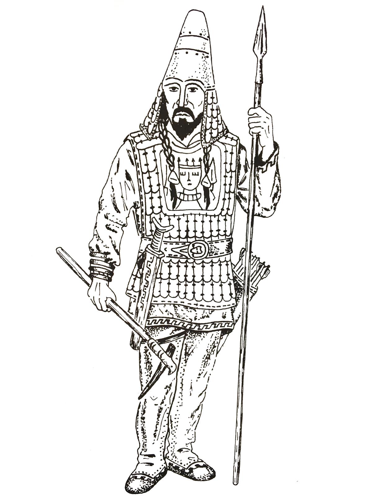 Vanimateks tõenditeks sõjavarustusest Lääne-Siberis on I aastatuhande lõpust e.m.a pärinevad luust plaatidega turvised. Meie ajaarvamise I sajandi alguses lisati turvisele pronksist plaat rinna kaitseks, aastatuhande keskpaigaks aga olid turvised üleni rauast naastudest. X–XII sajandil lisandusid kaitserüüle küünarnuki- ja põlvekaitsmed. Niisuguseid turviseid kasutati kuni XVII sajandini. Varaseimad peakaitsmed seisnesid tavalisele mütsile luu- või metallinaastude kinnitamises. I aastatuhande algusest e.m.a hakati kasutama koonilise tipuga kiivreid, millel oli ka ninakaitse. Hiljem tulid kasutusele ümarama kujuga kiivrid, mis võisid olla kaunistatud ka kullaga, nägu võidi varjata maskiga.